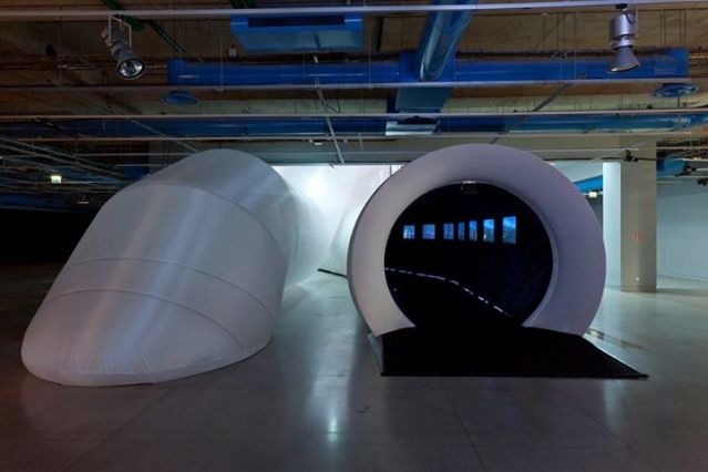 Si intitola Le train fantôme la nuova installazione del videoartista Charles de Meaux, in mostra al Centre Pompidou di Parigi ancora per pochi giorni. Dall’esterno somiglia a uno dei tubi simbolo dell’architettura del museo: rivestito di tessuto bianco, il tunnel presenta all’interno una serie di schermi paralleli che lo percorrono interamente, come i finestrini di un treno, proiettando immagini di città e paesaggi, colti in tutte le fasi del giorno, alternate a brevi flash di film cult. Sailor e Lula in auto, l’esplosione della villa nel finale di Zabriskie Point, Burt Lancaster su un trampolino in Un uomo a nudo, tratto dal bellissimo racconto Il nuotatore di John Cheever; e ancora Stromboli, Taxi driver, Il terzo uomo, Il bandito delle ore undici. Memore della prima installazione mai esposta al Beaubourg – Crocodrome di Tinguely, de Saint-Phalle e Luginbühl -, de Meaux ha voluto ricreare un percorso in cui l’immediatezza dell’immagine si impone sulla complessità del mondo e diventa medium di una memoria collettiva e condivisa. Ciò che lo spettatore guarda gli è già noto, ma nella sequenza delle scene proiettate e nella successione di schermi che catturano l’occhio uno dopo l’altro, senza mai permettergli di soffermarsi davvero, sta il potere di suscitare il ricordo, uno dei temi cui è dedicata questa edizione del Nouveau Festival nell’ambito del quale l’opera è esposta.