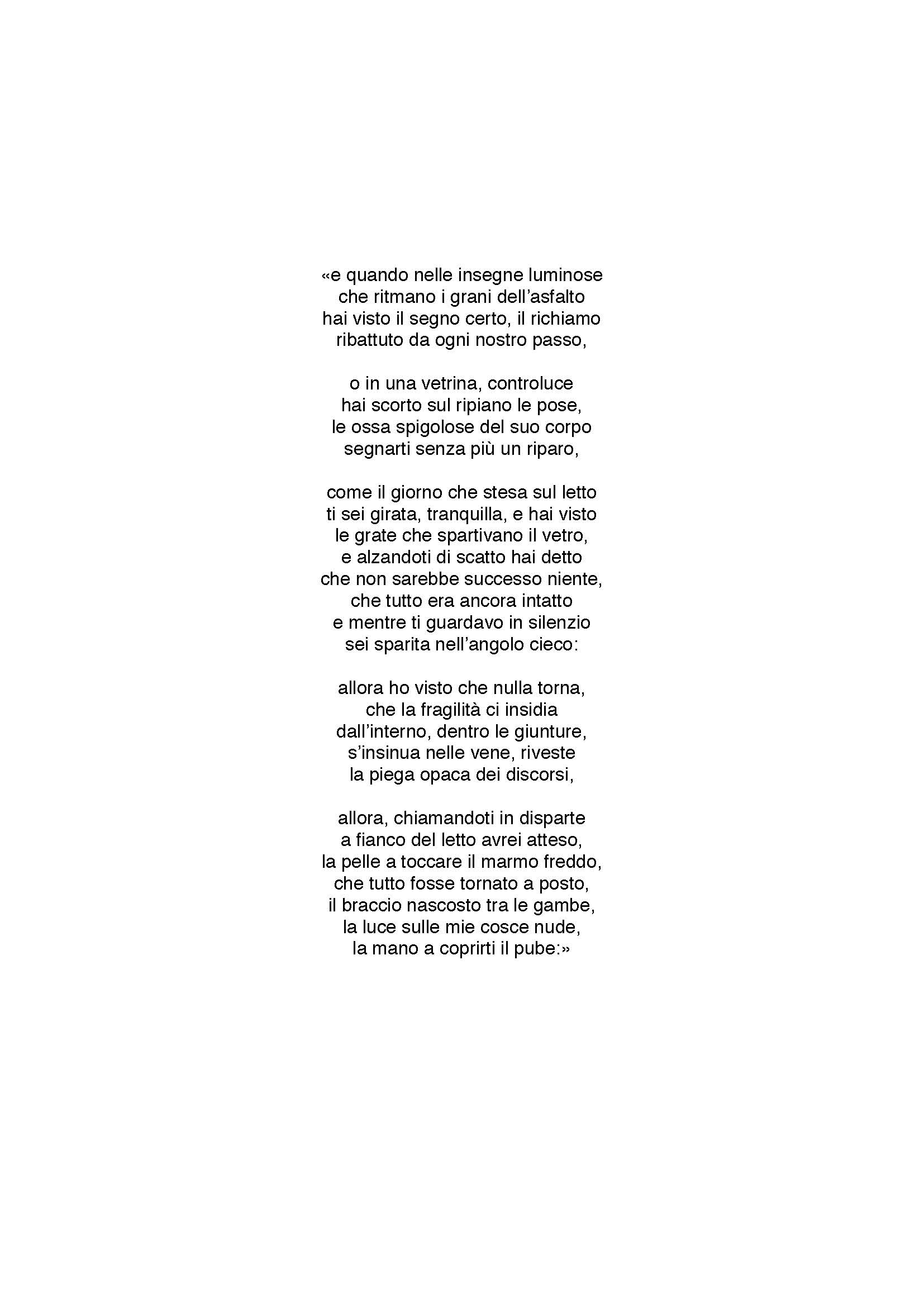 Gli esterni non sono più partecipi dell’avventura umana di quanto lo siano gli interni: “spazio deserto…sotto un lampione astioso…la fissità del cielo…statue mute…i tetti opachi e le lamiere arroventate…la distesa dei campi d’acqua…case abbandonate…fabbriche addormentate…l’armatura dei pilastri…erbe matte sul terreno…mattoni e lamiere ondulate…”). E la nebbia, il silenzio, in cui si muovono i due protagonisti, sospesi, incapaci di vera comunicazione. Italo Testa recita le sue parole in prima persona, si rivolge a un tu che stenta a raggiungere, a toccare concretamente: i due amanti sono descritti spesso in piedi, “appoggiati”, “affacciati”, zitti e in attesa, quasi a chiedere conforto e sicurezza alla realtà dei muri, dei balconi, degli oggetti. E non trovano certezza nei loro gesti, nei pensieri, nei reciproci abbandoni: “così aspettiamo giorno per giorno,/ un foglio in mano, lo sguardo perso”, “la fragilità ci insidia dall’interno”, “stiamo lì, col capo arrovesciato/ un po’ assonnati sopra il letto,/ le gambe appena reclinate/ contiamo le pieghe sul lenzuolo”, “il braccio nascosto tra le gambe, la luce sulle mie cosce nude,/ la mano a coprirti il pube”. In un’estraneità sofferta, immodificabile: “saremo corpi in attesa, tronchi/ riversi, distesi tra le cose”.