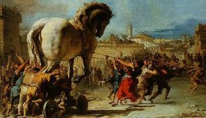 Neottolemo è al mio fianco. Lo sento ansimare, col suo caratteristico puzzo di cipolla e sudore. Lo spingo per farlo scostare, mi sta pestando il piede. L’oscurità è fitta, il silenzio è rispettato a fatica, qualcuno penserà che il cigolio delle ruote potrebbe consentire anche un temerario bisbiglio. Allora provo a fare un appello col passaparola, cerco di ricordare come sono disposti in fila fino al portellone d’uscita – quelli dietro di me capiranno da soli quando muoversi. Sussurro all’orecchio (anche quello puzza) di Neottolemo: “avverti Acamante e lui Toante e lui Tessandro e lui Stenelo e lui Menelao e lui Macaone e lui Epeo che manca poco; quando le ruote si fermeranno, Epeo aprirà il portellone e ci caleremo uno alla volta. Sarà facilissimo, gli dèi sono con noi”.