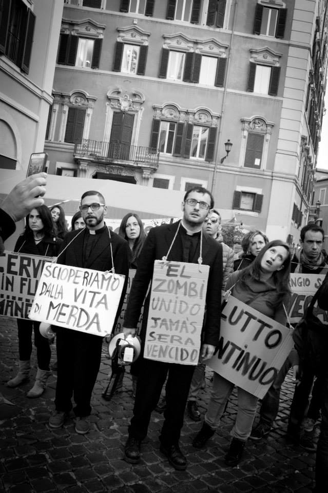 Il corteo avanza. Lento. Punti interrogativi si formano sopra la testa delle persone. “Oh povera Italia” dice qualcuno “siamo davvero ridotto così?”. I più giovani pensano invece ad Halloween che molti però pronunciano Aulin come la medicina. I giovani sghignazzano. Le turiste tedesche sono le più entusiaste. Una grida “Ehy guardate! Gli zombie! Gli zombie”. Qualcuno tira fuori gli smartphone. Ed ecco che un fuoco di flash colpisce il lento corteo dei non morti.