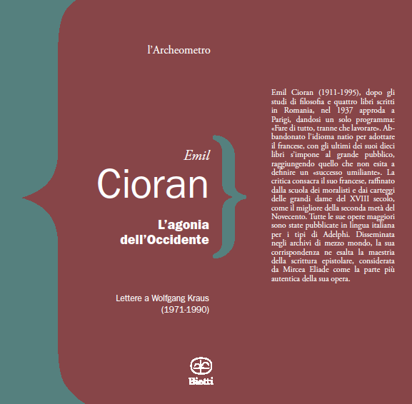 Per i tipi della casa editrice Bietti è recentemente uscito il libro di Emil Cioran, L’agonia dell’occidente – lettere a Wolfgang Kraus (1971-1990), un carteggio intercorso tra lo scrittore rumeno e il critico ed editore austriaco Wolfgang Kraus, con l’aggiunta, in appendice, di altre due lettere scritte dalla compagna di Cioran, Simone Boué, ed estratti del diario di Kraus che vertono sulla figura stessa di Cioran – la scoperta e la conseguente trascrizione di questo carteggio si deve a George Gutu, avvenuta in maniera casuale durante lavori di ricerca presso l’Archivio Letterario della Biblioteca Nazionale di Vienna.