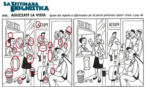 Sulla Settimana enigmistica c’era un gioco, che forse esiste ancora: “Aguzzate la vista”. Si trattava di scovare i 20 particolari che distinguevano due vignette molto simili e densamente popolate, disposte una accanto all’altra.