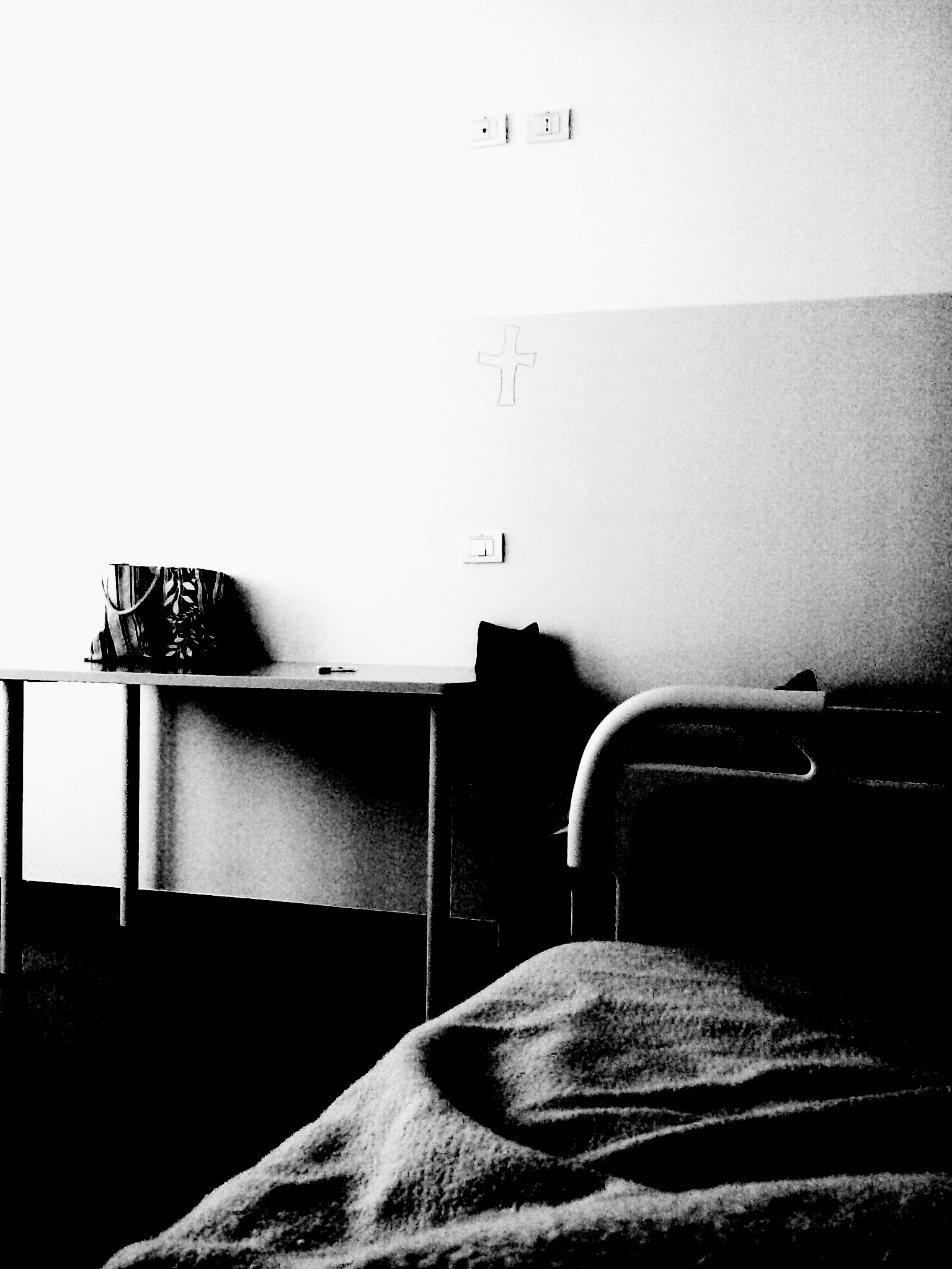 Il crocifisso è stato cancellato, mi solleva la vista di due toni : posso guardare il bianco, il rovescio di una traccia, la nostra testa grida e non emette suono.