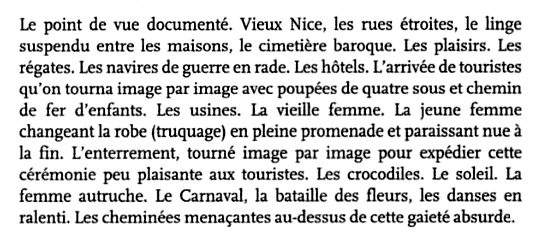 Il punto di vista documentato. La vecchia Nizza, le strade strette, i bucati appesi fra le case, il cimitero barocco. I piaceri. Le regate. Le navi da guerra in rada. Gli hotel. L’arrivo dei turisti che abbiamo girato in stop motion con delle bambole da quattro soldi e un trenino per bambini. Le fabbriche. La vecchia donna. La giovane donna che si cambia i vestiti (effetto speciale) in piena passeggiata e alla fine appare nuda. Il funerale, girato in stop motion per velocizzare questa cerimonia poco piacevole per i turisti. I coccodrilli. Il sole. La donna struzzo. Il Carnevale, la battaglia dei fiori, le danze al rallentatore. Le ciminiere minacciose sopra questa assurda allegria.