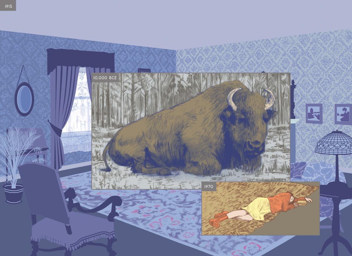 Qui inizia nel 1957, anno di nascita dell’autore, e apre il sipario su un salotto: poltrone, tavolo, carta da parati. In alto a sinistra è segnato l’anno in cui ci troviamo, così come, nell’angolo di ognuno dei riquadri che McGuire “ritaglia” all’interno della stanza, è segnato l’anno di riferimento. In una stessa immagine, dunque, succede di trovarsi simultaneamente nel 1970, davanti a una ragazza che legge distesa sul tappeto, e nel 10000 avanti Cristo, dove sullo stesso tappeto riposava un mammut, naturalmente millenni prima che quella casa venisse costruita. Oppure si assiste al pic nic di due aristocratici nel 1870, quando al posto delle pareti c’era ancora un bosco, ma in un rettangolo a sinistra un gruppo di amici gioca a Twister nel 1964. Nel 1984 una ragazza chiede all’amica che sta facendo esercizi ginnici davanti al camino: «Che mi racconti del palazzo di fronte?» e l’altra risponde sciattamente: «Benjamin Franklin viveva lì, o forse ha piantato un ciliegio in giardino. Qualcosa del genere»; dopo poche pagine, superfluo dirlo, siamo nel 1775, al cospetto di Benjamin Franklin che attende l’arrivo del figlio. Quale che sia l’anno in corso, la scena si svolge nello stesso rettangolo di spazio dove nel 1907 è stata costruita la casa che vediamo in quasi tutti i disegni: assistiamo anche alla costruzione delle sue fondamenta e del camino.