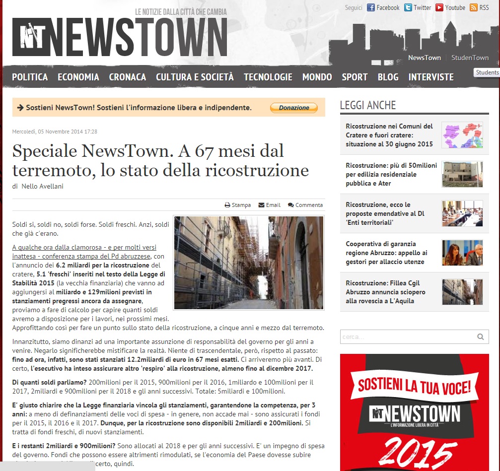 Cominciai a sentirne parlare da Mattia, uno dei fondatori, con cui vivevo insieme all’epoca. Mi disse che stavano cercando di mettere su un giornale, e aggiunse poco altro sullo stato dell’informazione in città, sulla necessità di fare qualcosa a riguardo. Io rincarai la dose sostenendo che i media locali fin dai primi giorni dopo il terremoto sono stati troppo passivi, decisamente poco critici su quanto avveniva. Dopo un anno e mezzo, quel proposito era online: NewsTown – le notizie dalla città che cambia, il nome del quotidiano, la pagina web a incidenza rossa, nera e grigia e il logo formato da una N e una T con un braccio di gru nel mezzo che sposta un pezzo della N.