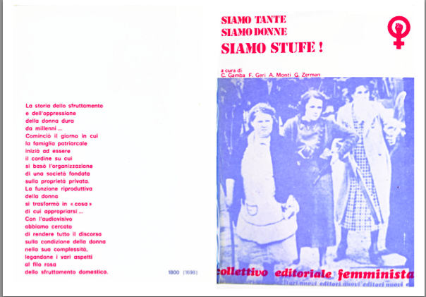 Al 1975 risale anche l’uscita di un opuscolo cartaceo tratto dall’audiovisivo Siamo Tante, Siamo Donne, Siamo Stufe!, realizzato da Chiara Gamba, Franca Geri, Adriana Monti, Grazia Zerman del Gruppo femminista milanese per il Salario al lavoro domestico***. Il documento viene pubblicato dal Collettivo Editoriale Femminista, che nasce a Padova nel 1974. L’audiovisivo, composto da varie diapositive che vengono proiettate e sincronizzate con un nastro su cui sono incisi il parlato e le musiche, viene pensato come uno strumento di intervento più efficace dei volantini e dei giornali cartacei per discutere tra donne della propria condizione di sfruttamento (domestico e non). Viene ideato dal gruppo milanese di Lotta Femminista. Quando LF si scioglie nell’ottobre del 1974, la campagna per il Salario al lavoro domestico viene portata avanti dai Comitati di Padova, Venezia, Trieste e Trento, e dai Gruppi femministi di Ferrara, Milano, Modena, Firenze e Napoli.