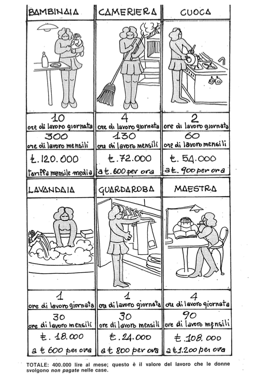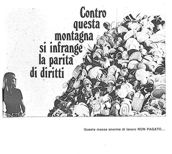 Commenta Adriana Perrotta qui sotto: “Suonano datati lo stile sloganistico, siamo nel pieno degli anni Settanta (così si parlava e si scriveva per smuovere le coscienze e invitare alla lotta), il rubricare tutto a lavoro domestico (mentre il concetto di cura è ben più ampio e complesso, come hanno messo in luce le ricerche e gli studi degli ultimi 40 anni); sbrigativo non considerare l’interiorizzazione di un modello di codificazione dei ruoli sessuali (derivato dalla divisione dalla del lavoro operata dal patriarcato) con tutte le conseguenze psichiche indotte, sia per gli uomini che le donne (le interiorizzazioni di fantasie, attese paure, immagini di genere…., la naturalizzazione di un ruolo che costituisce comunque uno straccio di identità al quale aggrapparsi, per spremerne ogni goccia di contropotere). Non a caso l’iniziativa dello “sciopero” del lavoro domestico lanciata allora fallì, perché molte dicevano che non volevano andare contro le esigenze di figli,…e quanti/e dipendevano dalle loro cure quotidiane. Sembrava che il “nemico” diventassero i “familiari” e non il sistema. Infatti allora si era in pieno “separatismo” di analisi, teorie e pratiche; il non aver coinvolto gli uomini, ugualmente dimidiati nella loro potenzialità dalla divisione patriarcale del lavoro, e l’aver completamente sottovalutato il terreno delle relazioni tra donne e uomini, tra donne e donne, tra uomini e uomini, l’ambito dell’affettività della sessualità, della creatività, cioè la dimensione dell’”autocoscienza”, fieramente avversata da alcune come terreno “borghese( su questo si era separato in due spezzoni il collettivo di Lotta Femminista di Milano), ha determinato il fallimento di questo filone del femminismo che sarebbe stato allora molto importante e “rivoluzionario”.