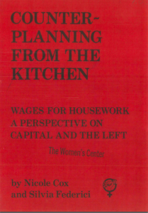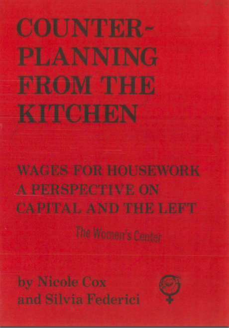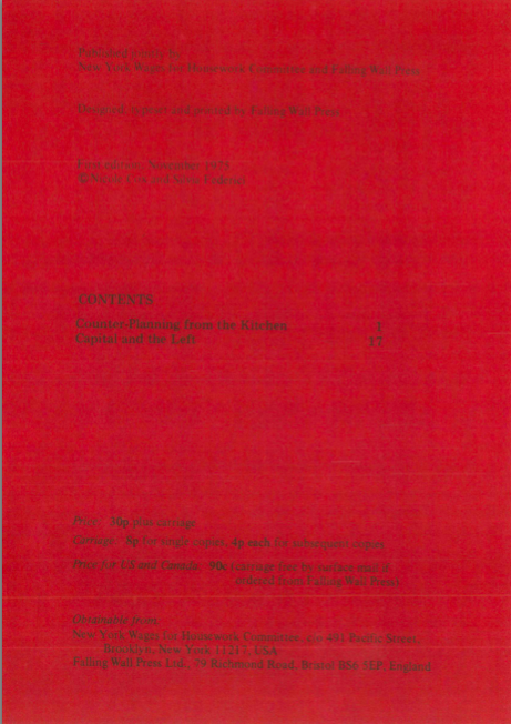 Nel 1975 il New York Wages for Housework Committee pubblica un opuscolo rosso intitolato Counterplanning from the Kitchen*, a cura di Silvia Federici e Nicole Cox. Si tratta di due articoli brevi (in tutto meno di trenta pagine): il primo, che dà il titolo al fascicolo omonimo, e l’altro intitolato “Capital and the Left”. Il libretto viene tradotto in italiano tre anni dopo, nel 1978. Stesso titolo, ma copertina turchese, edito da Marsilio e curato dal Collettivo Internazionale Femminista, contiene in più il testo-manifesto di Federici “Salario contro il lavoro domestico”**.