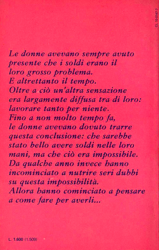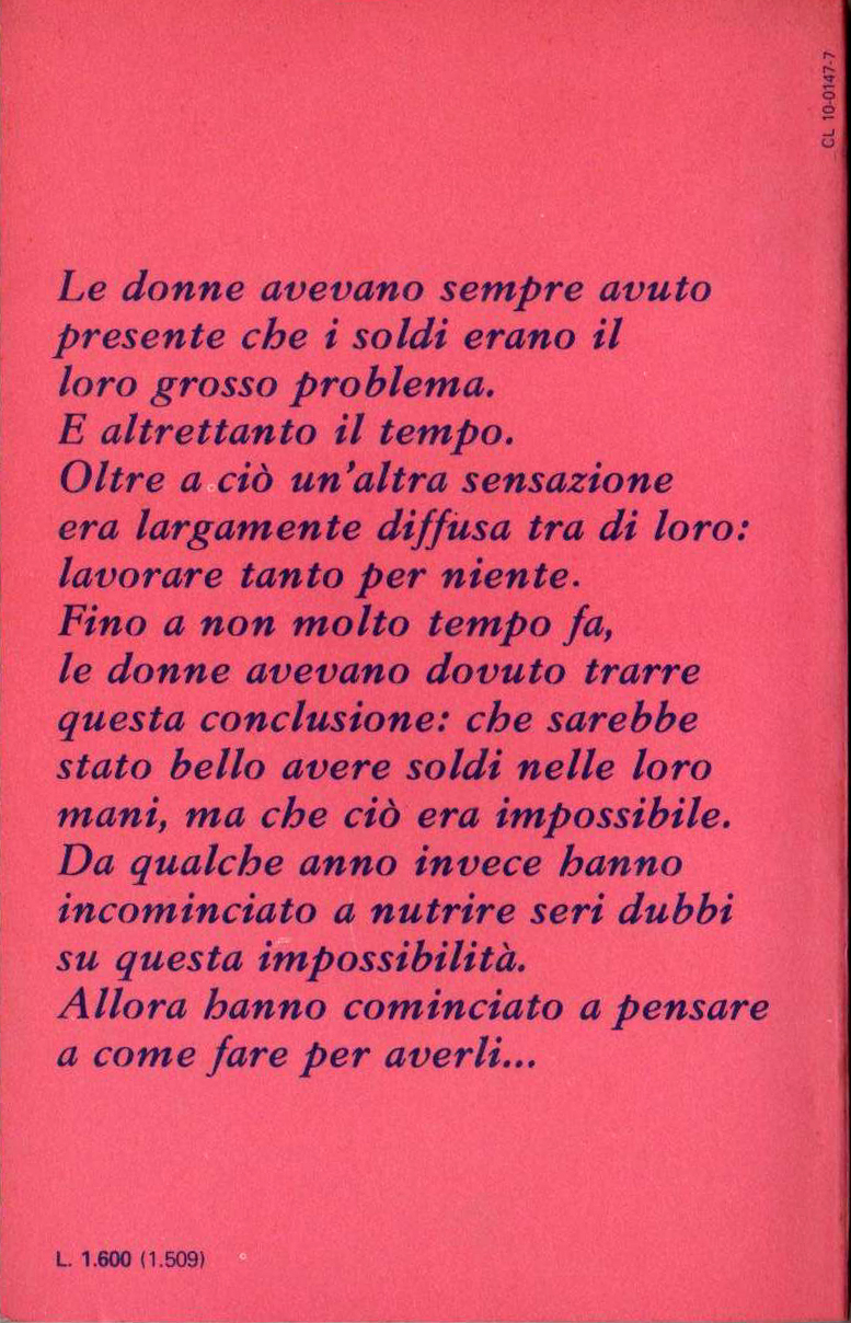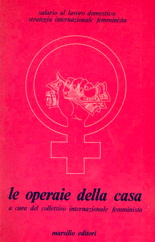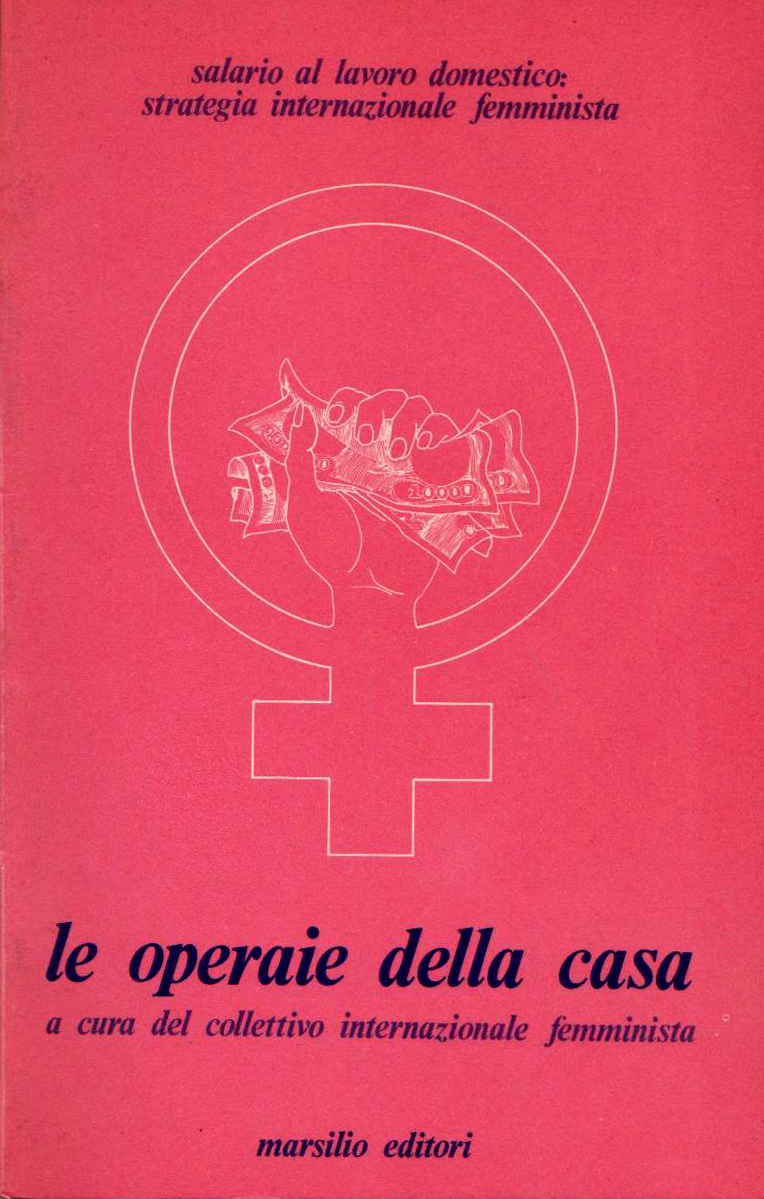 Infine, siamo ancora nel 1975, viene pubblicato a cura del Collettivo Internazionale Femminista di Padova, Le operaie della casa (Marsilio, 78 pagine). La copertina questa volta è rosa. Il salario è sempre al centro delle rivendicazioni. Si tratta di farne “una leva di potere per cui le donne riescano in una posizione di forza a contrattare le condizioni del lavoro domestico stesso, le condizioni del lavoro esterno, le condizioni dei servizi, le condizioni della procreazione e della sessualità.” Come spiega Mariarosa Dalla Costa in un intervento del 2006 (“Autonomia della donna e retribuzione del lavoro di cura nelle nuove emergenze”), “la maternità divenne un punto cardine del nostro discorso: se la produttività della famiglia capitalistica e del corpo femminile passava per la produzione di figli, la liberazione della donna passava anche attraverso il rompere con questa imposizione, con questa unicità di funzione ascritta, con la fissità di questo ruolo. Da cui lo slogan Donne, partoriamo idee non solo figli!, un grido di liberazione dal comandamento biologico, un invito a una creazione diversa, partorire idee che riuscissero a generare un altro mondo dove il ruolo di moglie-madre non costituisse l’unica identità possibile né fosse pagata a tale prezzo di fatica, isolamento, subordinazione, mancanza di autonomia economica”.