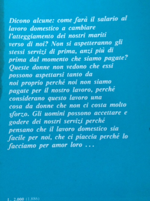 Suonano datati lo stile sloganistico, siamo nel pieno degli anni Settanta (così si parlava e si scriveva per smuovere le coscienze e invitare alla lotta), il rubricare tutto a lavoro domestico (mentre il concetto di cura è ben più ampio e complesso, come hanno messo in luce le ricerche e gli studi degli ultimi 40 anni); sbrigativo non considerare l’interiorizzazione di un modello di codificazione dei ruoli sessuali (derivato dalla divisione dalla del lavoro operata dal patriarcato) con tutte le conseguenze psichiche indotte, sia per gli uomini che le donne ( le interiorizzazioni di fantasie, attese paure, immagini di genere…., la naturalizzazione di un ruolo che costituisce comunque uno straccio di identità al quale aggrapparsi, per spremerne ogni goccia di contropotere). Non a caso l’iniziativa dello “sciopero” del lavoro domestico lanciata allora fallì, perché molte dicevano che non volevano andare contro le esigenze di figli,…e quanti/e dipendevano dalle loro cure quotidiane. Sembrava che il “nemico” diventassero i “familiari” e non il sistema. Infatti allora si era in pieno “separatismo” di analisi, teorie e pratiche; il non aver coinvolto gli uomini, ugualmente dimidiati nella loro potenzialità dalla divisione patriarcale del lavoro, e l’aver completamente sottovalutato il terreno delle relazioni tra donne e uomini, tra donne e donne, tra uomini e uomini, l’ambito dell’affettività della sessualità, della creatività, cioè la dimensione dell'”autocoscienza”, fieramente avversata da alcune come terreno “borghese( su questo si era separato in due spezzoni il collettivo di Lotta Femminista di Milano), ha determinato il fallimento di questo filone del femminismo che sarebbe stato allora molto importante e “rivoluzionario”.