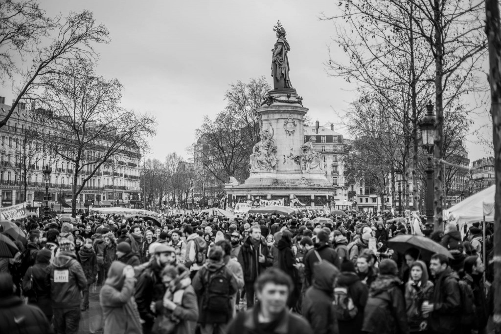 Il 31 marzo a Parigi – Place de la République, verso sera– migliaia di persone si sono ritrovate dopo una lunga e piovosa giornata di sciopero contro la Loi Travail, per passare insieme la nuit debout.