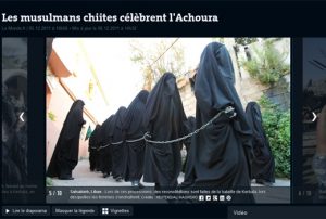 La fotografia, pubblicata nel 2011 da Le Monde, è autentica. E’ stata scattata in Libano, durante le celebrazioni della Ashura, una ricorrenza dell’Islam sciita che assumono talvolta la forma di rievocazioni allegoriche. Cioè è una foto autentica che registra la realtà di una allegoria messa in scena da una denominazione religiosa che con Stato Islamico non ha nulla a che fare, anzi attualmente gli si oppone.