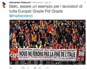 Anatole. Tra i tanti fatti di casa nostra che si potrebbero associare a questo che presenti, mi viene in mente la foto fotoscioppata di un corteo contro la loi travail in Francia alla fine del maggio scorso, quella che ritraeva i manifestanti dietro uno striscione della CGT (Confédération Générale du Travail, la CGIL francese per capirci) sul quale ci sarebbe stato scritto «Nous ne ferons pas la fine de l’Italie». Si trattava chiaramente di un falso, un’elaborazione grafica, dunque racconta un fatto mai avvenuto. Fatti linguistici puntavano inesorabilmente in questa direzione, senza che ci fosse nemmeno bisogno dell’intervento del filologo. Senza calcolare l’improbabilità del costrutto maccheronico «ne ferons pas la fine de l’Italie», quindi l’incongruenza sintattica, la parola «fine» è in francese aggettivo femminile, qui scambiato per il sostantivo «fin» e corretta in «fin» in versioni più recenti della stessa elaborazione grafica. L’immagine la trovavi condivisa sulle pagine dei social network dell’autore di corsivi antigovernativi al vetriolo de Il Fatto Quotidiano, senza nemmeno la decenza di una parola di scusa nei confronti delle centinaia di (più o meno) ingenui lettori, che l’hanno a loro volta propagata a macchia d’olio. Anzi, il nostro giornalista professionista provava poi addirittura a farci lo splendido, additando al pubblico ludibrio una povera disperata che richiedeva per Renzi lo status di dittatore e la pena di morte per i dissidenti. Il fatto di aver procurato l’isteria di una povera di spirito non rendeva meno grave che un giornalista professionista diffonda un conclamato falso senza verifica.