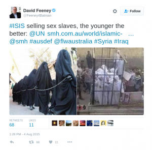 Lorenzo. A proposito di vero e falso, autentico e genuino nell’epoca postmoderna della postverità l’esempio che subito mi viene in mente in relazione ai miei interessi mediorientali è la storia del mercato degli schiavi nei territori di Stato Islamico. Il meme che ancora circola in rete, che non ha mai smesso di circolare, è questa fotografia che ritrae donne in abaya e niqab che, incatenate, si dirigono da qualche parte accompagnate dai loro aguzzini.