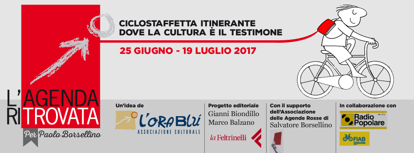 Il 19 luglio di quest’anno sono 25 anni dalla tragica scomparsa di Paolo Borsellino (e, ovviamente, di quella di Giovanni Falcone e di tutte le altre vittime delle due stragi). Gli amici dell’Orablù vogliono commemorarlo attraversando l’Italia da Milano a Palermo in bicicletta. Portandosi dietro una agenda rossa identica a quella trafugata nei momenti concitati della strage, per poterla riempire di testimonianze raccolte lungo la strada e infine consegnarla nelle mani dei parenti di Borsellino. Di tappa in tappa ci saranno letture, eventi, spettacoli, dibattiti, etc.