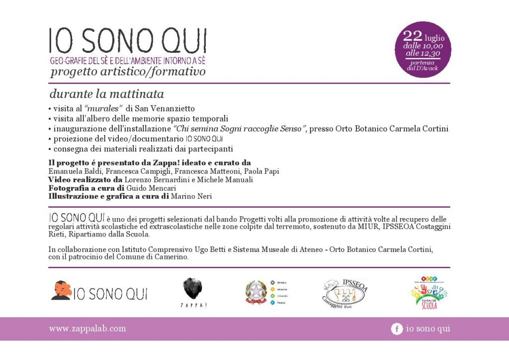 Si conclude il 22 luglio l’esperienza di “IO SONO QUI. Geo-grafie del sé e dell’ambiente intorno a sé” progetto laboratoriale diretto ai bambini di Camerino di cui si può leggere QUI la descrizione. Per chi volesse seguirci su facebook, questa è la nostra pagina, con le foto, i video e i racconti settimanali: https://www.facebook.com/iosonoqui.lab/