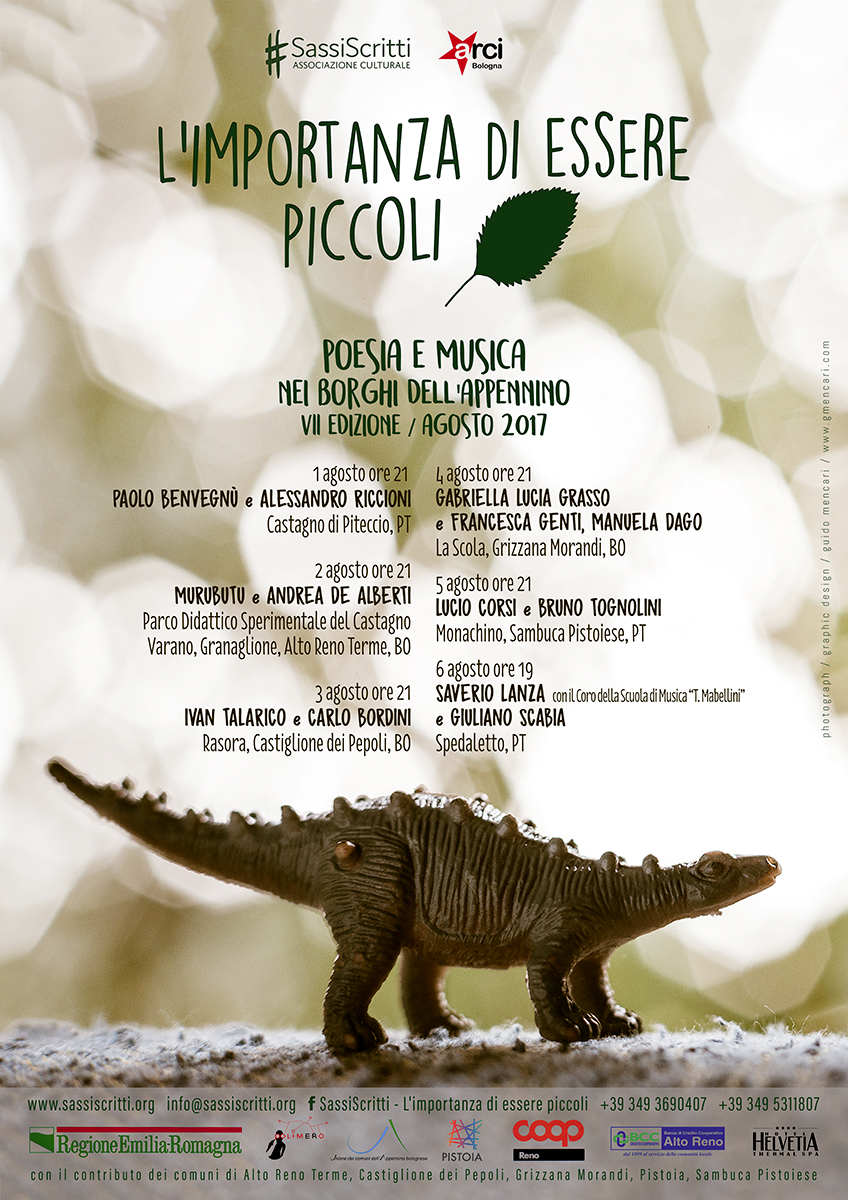Un dinosauro giocattolo a capo di una sequela di esploratori che il primo agosto inizia la sua avventura dal versante toscano, dalla minuscola stazione di Castagno di Piteccio (PT) per ascoltare Paolo Benvegnù e il suo viaggio interstellare dentro i misteri di “H3+”, la molecola che sta alla base dell’Universo ispiratrice del suo ultimo album. Con lui Alessadro RIccioni poeta e bibliotecario dell’Appennino dei cui nativi ‘monti tondi’ la sua poesia porta traccia. La tribù del dinosauro il 2 agosto si sposta in Emilia e si addentra in un bosco di castagni monumentali nei pressi di Granaglione, qui la parola si fa epica grazie alla ‘letteraturap’ di Murubutu, in cui sonorità hip hop classiche fanno da tappeto a testi dalla forte curvatura cantautorale; insieme al “cantante filosofo” il “poeta-oste” Andrea de Alberti che con le poesie tratte dal suo Dall’interno della specie (Einaudi 2017) intraprende un viaggio antropologico-sentimentale dentro l’umanità. Cambiando versante il dinosauro il 3 agosto arriva a Rasora, nel comune di Castiglione dei Pepoli (BO) accolto dall’antica Casa del Popolo e dai testi scanzonati del cantautore Ivan Talarico, già attore e autore di libri dal sapore ironico. Uno sguardo limpido e sbarazzino è anche quello di Carlo Bordini, poeta e narratore romano che, pur non rinnegando le difficoltà dell’esistenza, non cede mai il fianco al nichilismo. Giunti a metà percorso le orme preistoriche conducono a La Scola nel comune di Grizzana Morandi in uno dei borghi più belli del versante bolognese: qui risuonano tre voci femminili, quella dal timbro purissimo della siciliana Gabriella Lucia Grasso che presenta il suo ultimo album Vussia Cuscenza, uscito per Narciso Records, etichetta indipendente fondata da Carmen Consoli. Se la Grasso porta nel fresco delle montagne un po’ della luce catanese, dal nord arrivano le sorprendenti Manuela Dago e Francesca Genti poetesse unite da un’amicizia profonda e dal progetto editoriale Sartoria Utopia, una ‘capanna editrice’ che produce libri di poesia cuciti a mano. Come un cerchio magico la chiusura del festival è in Toscana: venerdì 5 agosto a Monachino, nel comune di Sambuca Pistoiese (PT), in una graziosa valle in cui si intrecciano 4 province. Ad accogliere il dinosauro sono gli animali selvatici evocati dal giovane cantautore maremmano Lucio Corsi nel suo disco delicato e metamorfico Bestiario musicale. La poesia è invece affidata alla voce incantatrice di Bruno Tognolini, autore generalmente considerato per bambini anche se come dice lo stesso poeta, due volte Premio Andersen, quello che scrive è “per i bambini e i loro grandi”.
