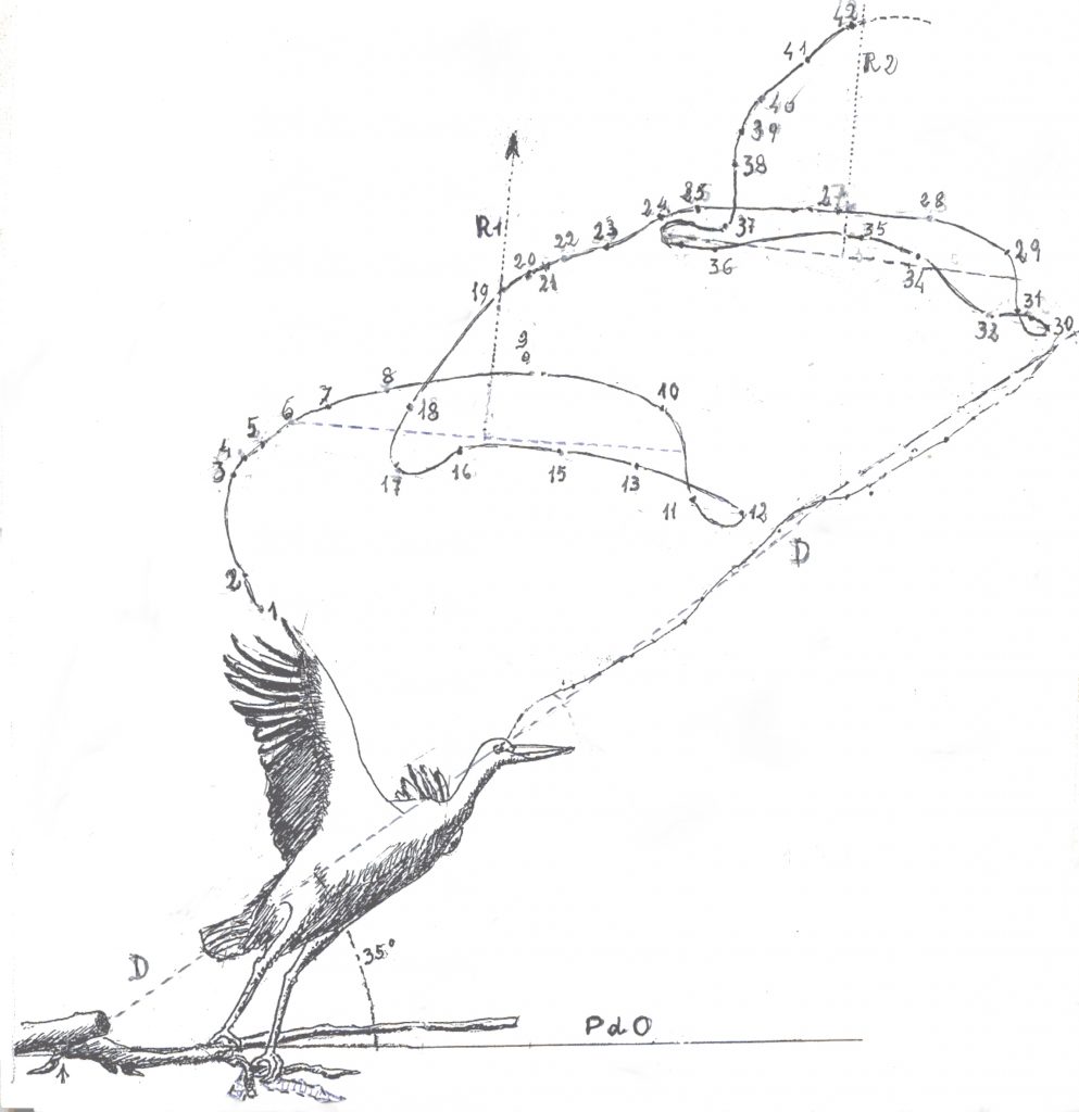 Filmare il volo degli aironi e poi separare i fotogrammi. Disegnava su lucidi sovrapposti ai fotogrammi e poi li colorava. Diverse posizioni dell’ala in progressione. Nelle zone intermedie si impara a volare. Ad esempio un piano statico su cui si disegnano battute di volo.