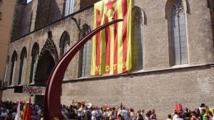 Se esci dalla stessa porta [stavo parlando della cattedrale di Santa Maria del Mar] e guardi quello che prima non avevi visto tanta era l’ansia di entrare a vedere quella meraviglia che già lo sapevo che era tale l’avevo vista tante volte ma così sempre desidero fare nei posti rivedere le cose già viste che sono sempre diverse dal ricordo che ne conservo e hanno sempre cose nuove da dire e da mostrare ad esempio quel dettaglio lì del portale mai l’avevo notato se appunto esci ti trovi in una piazza che ha il nome di Fossar de les moreres come dire il fossato ma come ora saprete anche la fossa dei gelsi quelli che fanno le more ed è una piazza non tanto grande ma famosa e tristemente famosa per i catalani che l’11 settembre 1714 ma che cos’avrà mai questa malefica data dell’11 settembre che si ripete così spesso conobbero e patirono sulla loro pelle la fine dell’indipendenza quando il re Filippo V di Spagna un Borbone naturalmente vinse la guerra cosiddetta di successione spagnola e la Catalogna venne completamente assoggettata malgrado il re avesse giurato fedeltà alla costituzione figuriamoci quanto gliene importava eliminate tutte le promesse e le leggi nazionali lui la chiamò la nova planta sempre diffidare dei nuovi ordini ormai dopo tanti esempi un nuovo ordine cioè che da allora i catalani piangono e tutti gli anni celebrano i catalani hanno memorie da elefanti e hanno messo anche una grande scritta che corre lungo tutta la piazza che riprende un verso di un loro grande poeta Frederic Coler che dice Al fossar de les Moreres no s’hi enterra cap traïdor, fins perdent nostres banderes serà l’urna de l’honor – Als martirs del 1714 perché come accuratamente mi spiegano in quella sanguinosa battaglia molti dei disperati difensori barcellonesi ma si badi bene nessun traditore furono sepolti esattamente là in quel luogo forse c’erano ancora delle more sui gelsi o forse quelle more sono poi nate dal sangue non so dopodiché gli hanno tirato sopra una bella gettata di cemento che sempre bene nasconde queste così frequenti e insensate attività degli umani
