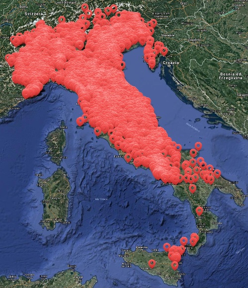 Dando uno sguardo alla mappa dell’⇨ Atlante delle Stragi Nazifasciste in Italia, colpisce questa nuvola cosi densa di segni rossi delle etichette luogo di Google Maps, tale da non lasciare quasi intravedere l’orografia del territorio, e ingrandendo con lo zoom, ecco che si evidenzia come quasi ogni piccolo paese ne fu colpito in misura maggiore o minore.