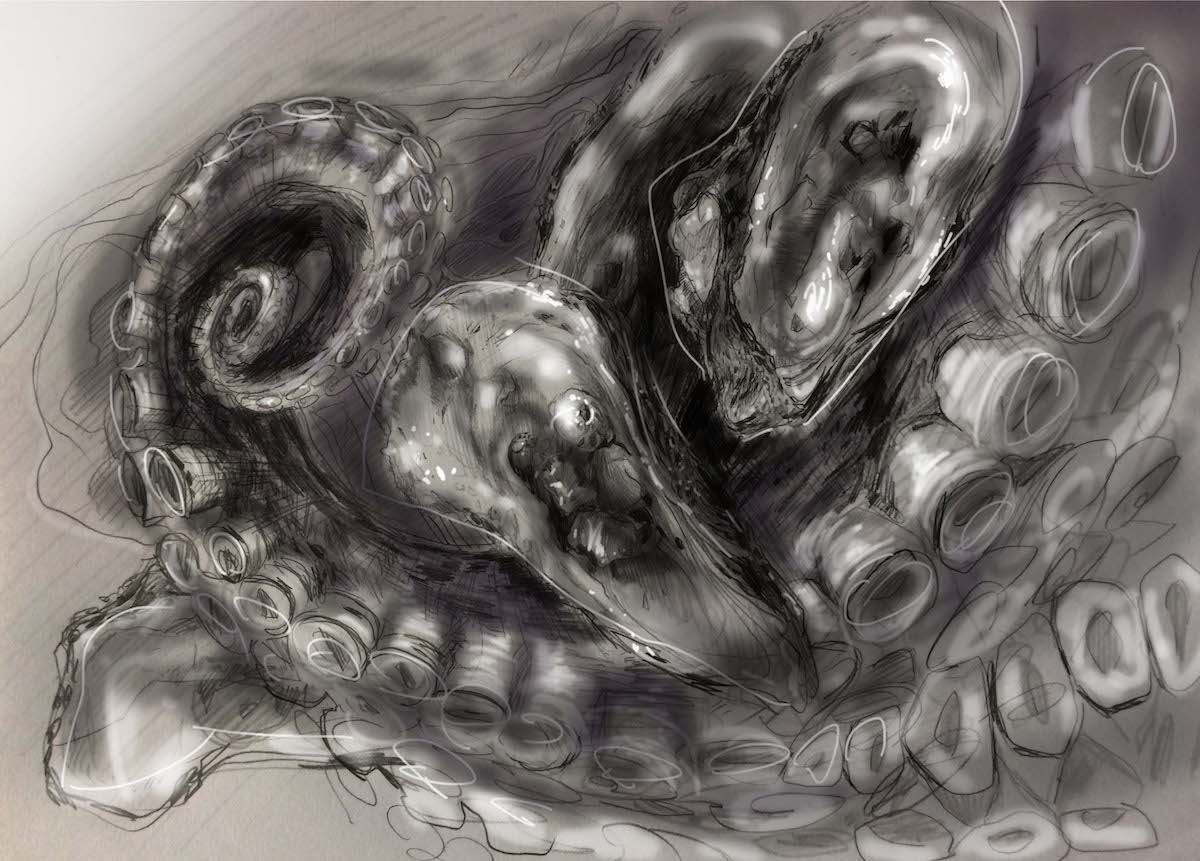 Polipi: animali da congelare affinché le loro carni si sfibrino e siano tenere in bocca. Cotture prolungate in cocci a fuoco lento. Bestie che non si concedono facilmente, pescate di fiocina, battute a violenza, si arricciano a fatica, più ardue degli scogli ai quali s’aggrappano.