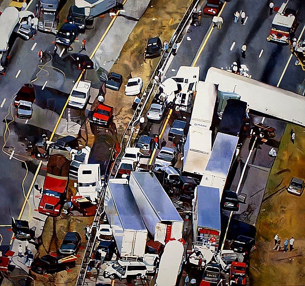 Scende nel porto e cerca di dipingerne uno. Le dimensioni sono enormi, sfuggono. E poi c’è la faccenda meteorologica. La luce cambia, o piove: è un casino. Così decide di lavorare a partire da fotografie, cartoline, depliant. Le copia letteralmente. Trasferisce non il transatlantico, ma la fotografia, su tela. L’ingrandisce, facendole fare un enorme salto di scala. Lo chiameranno Iperrealismo, Foto realismo, o – come preferiva Morley – Superrealismo. Con lui cui sono Chuck Close, Ralph Goings (e prima di loro Richard Artschwager). Rispetto ai mezzi di riproduzione meccanica della Pop Art, gli “iperrealisti” compiono il gesto inverso. Dipingono a mano. Morley utilizza una lente di ingrandimento e una griglia fittissima. Capovolge il quadro e lo nasconde, fatta eccezione per la minuscola porzione da dipingere. Vuole restare distaccato. Vuole: «far affiorare la superficie della tela, ma senza provocare onde». Tutto è piatto, il tocco invisibile, cancellato.
