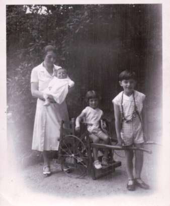 [ è il 1930 – ma le scarpine dei fratelli – con la punta a biscotto e il cinturino – sono le stesse della “bimba d’albero” – le bicolori traforate di Anna Maria – sempre con il cinturino – erano di gran moda negli anni ’30 – Gianni appena nato è in braccio alla mamma – Giancarlo da bravo cavallino ha al collo dei sonagli – lo senti il tintinnio? – Ginio – seduto sul carrettino – è imbronciato come in tutte le foto che lo ritraggono – pettinato alla paggio per anni – perché la madre avrebbe voluto una bambina – veniva regolarmente preso in giro dai compagni di classe ]
