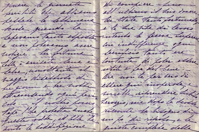 … le giornate terribili che abbiamo passato la settimana scorsa quando la sapevamo tanto esposta e non potevamo avere notizie.- Per fortuna ella è arrivata sana e salva, nonostante il viaggio disastroso di tre giorni e tre notti attraversando ogni pericolo.- Il nostro povero Papà l’ha protetta anche stavolta, ed ella ha avuto la soddisfazione di compiere fino all’ultimo il suo dovere.- Era stata tanto fortunata e la sua vita di lavoro intanto le faceva superare con indifferenza ogni sacrificio, tanto era contenta di poter essere utile e far del bene e vorrebbe riprendere subito servizio, ma dopo la ferita ricevuta, ha bisogno di un po’ di riposo e la quiete completa della campagna…