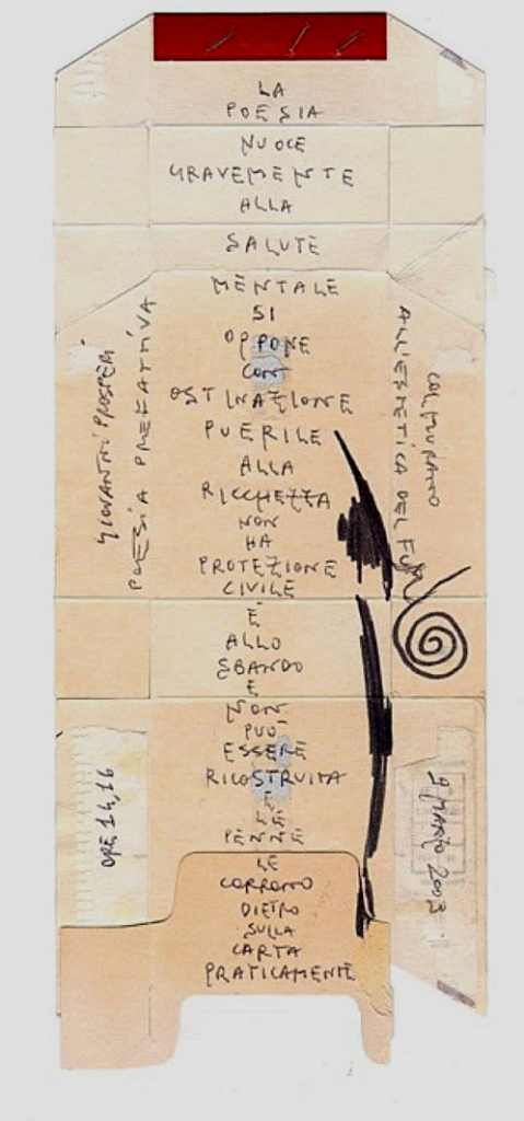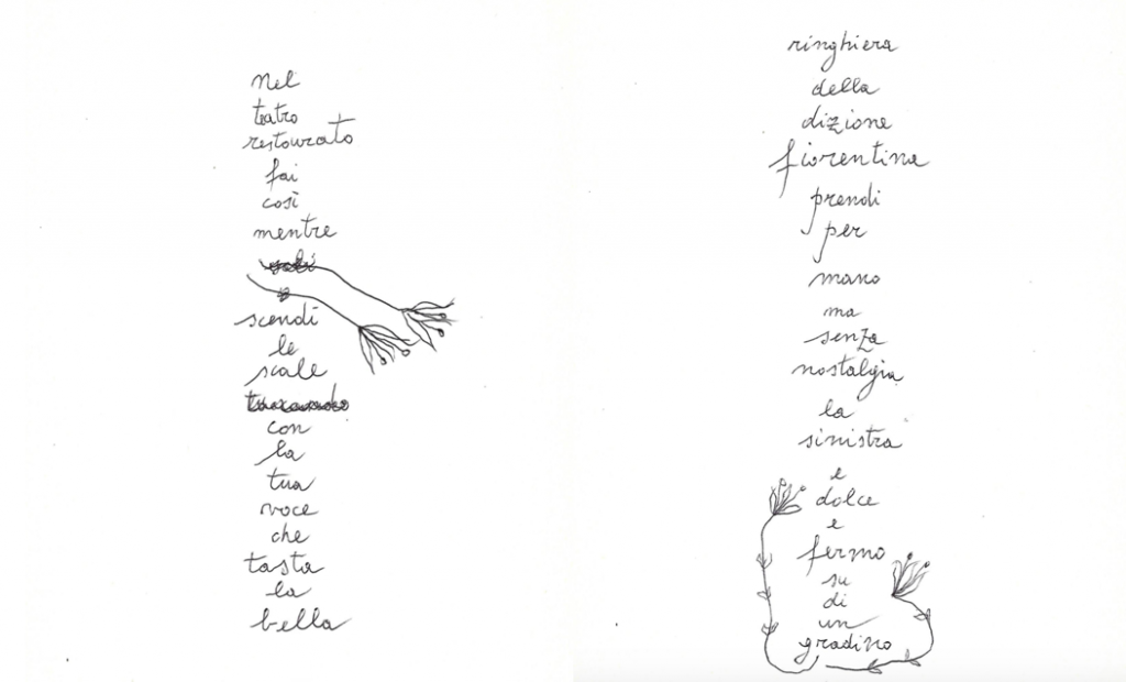 Bisognerà dunque studiare le rotanti germinazioni di Prosperi al di là di questa miglioria domestica o giardiniera (per quanto miracolosa), oltre le smunte vocazioni calligrammatiche e le devastazioni in cui s’affaccendano gli artisti dell’infernale cimiciaio contemporaneo. Giovanni ha frequentato ben altro apprendistato (“doveva essere Roma quel quartiere del mondo dove incontrai Emilio Villa”, confida in un appunto), ed è forse per questo che nella sua poesia il pensiero si fa agire, dove “si fa agire” potrebbe essere inteso nel doppio orizzonte di quanto del pensiero partecipa attivamente allo schiudersi delle forme (come neumi vegetali partoriti dalla coincidenza tra idea e azione, da questo condurre la materia pensata a materiale gestazione 2) e di quanto si fa prendere nella trama, si fa raschiare e bucare dal libero andare della mano: una mina di colore fatta brillare sopra una riga, una cancellatura come uno sputo d’intonaco, e due o tre tremori che concimano -quasi in ogni lettera- il principio di un diverso bocciolo…