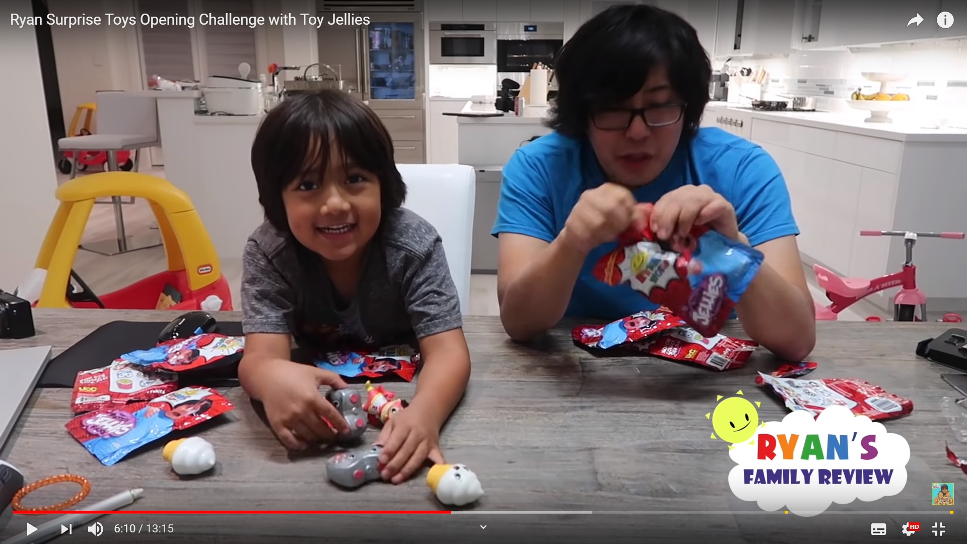 Appena Ryan e suo padre arrivano di fronte a lei, la madre appoggia sul tavolo una borsa di plastica: “I’ve found something at Target” (una catena di supermercati). Ryan e il padre ne svuotano il contenuto, 10 sacchetti di “Ryan’s jellies”, bustine con dei regalini “a sorpresa”, dei pupazzetti gommosi schiacciabili. La madre si rivolge al figlio per dirgli: “Ryan’s jellies… Are you a jelly?”. Si tratta in effetti di oggetti di merchandising ispirati al canale di Ryan, la serie 1 delle “Mystery Jellies Figures” di marca “Ryan’s World” (TM). Parte ora la piccola sigla del canale.