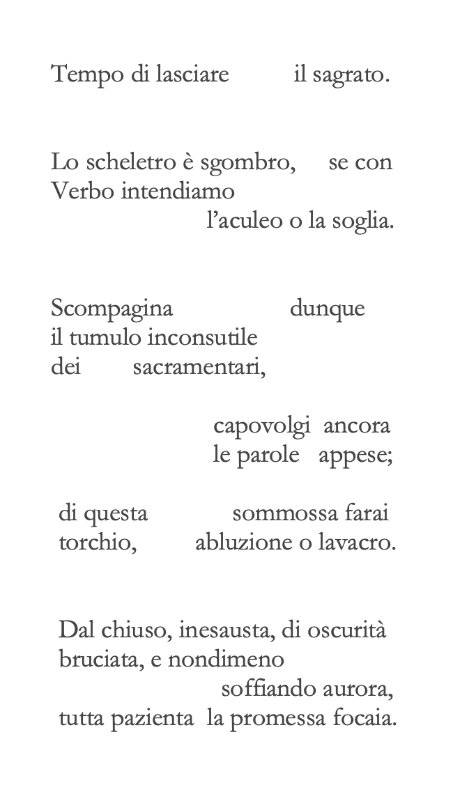 Giorgiomaria CornelioGiorgiomaria Cornelio è nato a Macerata nel 1997. È poeta, scrittore, regista, performer e redattore di «Nazione indiana». Ha co-diretto la “Trilogia dei viandanti” (2016-2020), presentata in numerosi festival cinematografici e spazi espositivi. Suoi interventi sono apparsi su «L’indiscreto», «Doppiozero», «Antinomie», «Il Tascabile Treccani» e altri. Ha pubblicato La consegna delle braci(Luca Sossella editore, Premio Fondazione Primoli), La specie storta (Tlon edizioni, Premio Montano, Premio Gozzano), L’Ufficio delle tenebre e il saggio Fossili di rivolta. Immaginazione e rinascita (Tlon Edizioni). Ha curato il progetto Ogni creatura è un popolo (NERO Editions)e per Argolibri, l’inchiesta letteraria La radice dell’inchiostro. La traduzione di Moira Egan di alcune sue poesie scelte ha vinto la RaizissDe Palchi Fellowship della Academy of American Poets. Con le sue opere ha partecipato a festival e spazi come Biennale Venezia College, Mostra internazionale del nuovo cinema, Rencontres internationales paris/berlin, Centrale Fies. È il vincitore di FONDO 2024 (Santarcangelo Festival), uno dei direttori artistici della festa “I fumi della fornace” e dei curatori del progetto “Edizioni volatili”. È laureato al Trinity College di Dublino e dottorando allo Iuav di Venezia.