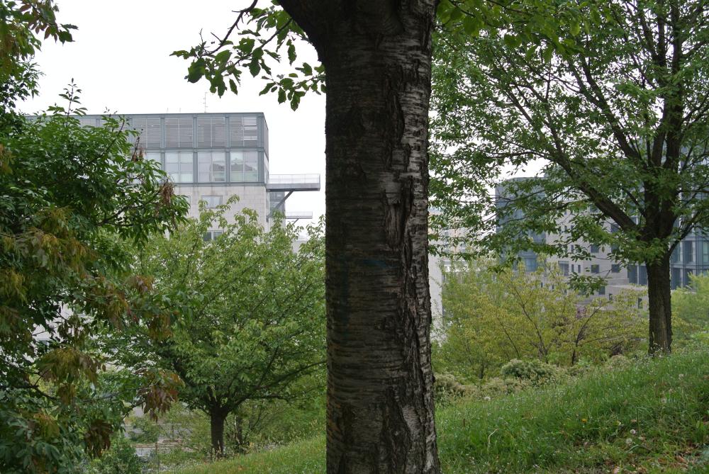 In fondo al Borgo Pirelli, i “pezzi della Bicocca d’un tempo” stanno frantumati sotto uno strato di terra: è la collina (artificiale) dei ciliegi creata ex novo durante i lavori di rigenerazione del vecchio quartiere industriale, accumulando qui (dove era assolutamente piano), fino a 25 m. d’altezza, i detriti degli abbattimenti, ricoprendoli quindi di terra e piantumandoci sopra una parchetto alberato, punteggiato – come da nome – da alberi di ciliegio, che in primavera donano al luogo una delicata fioritura. Dalla cima, verso sud si domina la vista dello skyline di Milano, e sotto, ad est, quella della Nuova Bicocca con le sue sagome gregottiane squadrate, spigolose, ancora tanto razional-novecentesche.[4](così diverse dalle stupefacenze curvilinee della successiva Milano postmoderna, tipo Citylife o Porta Nuova. Tipologie edilizie di cui Gregotti dice che sono concepite come ingrandimento di un oggetto di design, dove non conta più nulla il problema dello spazio fra le cose[5]).