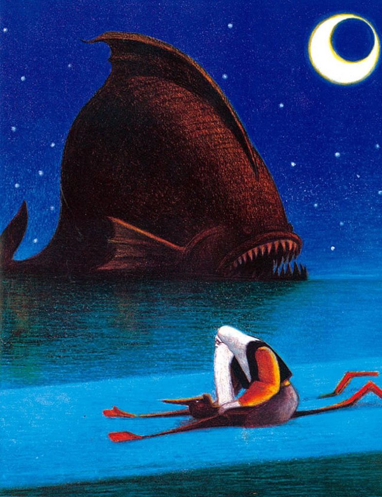 […] E così camminarono un bel pezzo, e traversarono tutto il corpo e tutto lo stomaco del Pesce-cane. Ma giunti al punto dove cominciava la spaziosa gola del mostro, pensarono bene di fermarsi per dare un’occhiata e cogliere il momento opportuno alla fuga. Ora bisogna sapere che il Pesce-cane, essendo molto vecchio e soffrendo d’asma e di palpitazione di cuore, era costretto a dormire a bocca aperta: per cui Pinocchio, affacciandosi al principio della gola e guardando in su, poté vedere al di fuori di quell’enorme bocca spalancata un bel pezzo di cielo stellato e un bellissimo lume di luna.