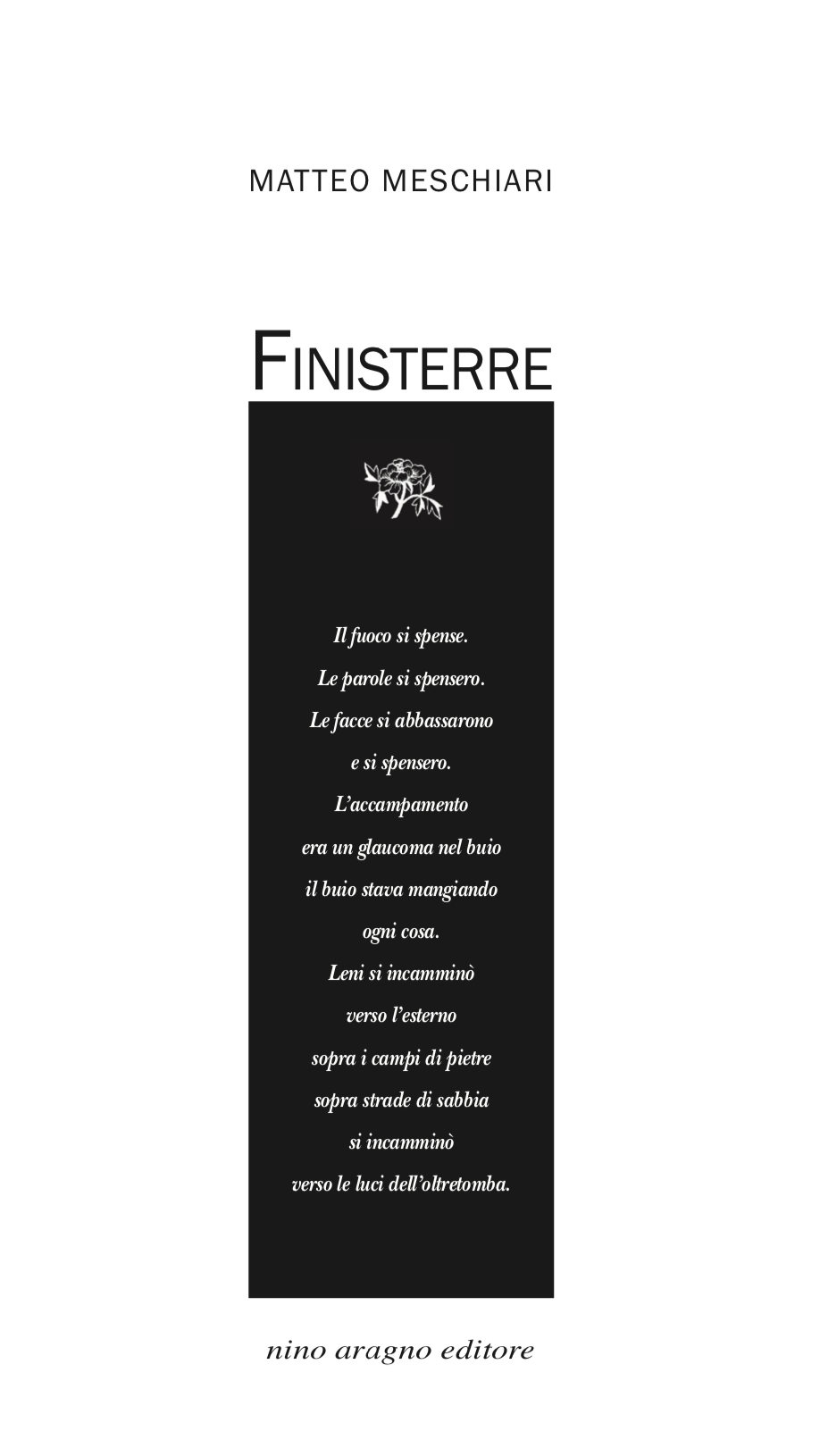 Per la Nino Aragno Editore, nella collana I domani (curata da Maria Grazia Calandrone, Andrea Cortellessa e Laura Pugno), è uscito recentemente Finisterre, poema epico di Matteo Meschiari «composto oralmente e poi trascritto».
