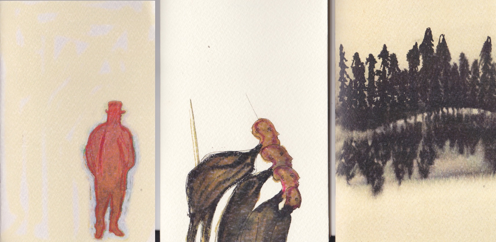 I tre titoli sono: Siluet di Nicola Passerini, Nove di Carlo Selan, Pasifae di Francesco Iannone; ne pubblico qui alcune pagine. Le partiture visive e i segnalibri sono di Giuditta Chiaraluce, ad eccezione di Siluet, che è stato illustrato dall’autore.