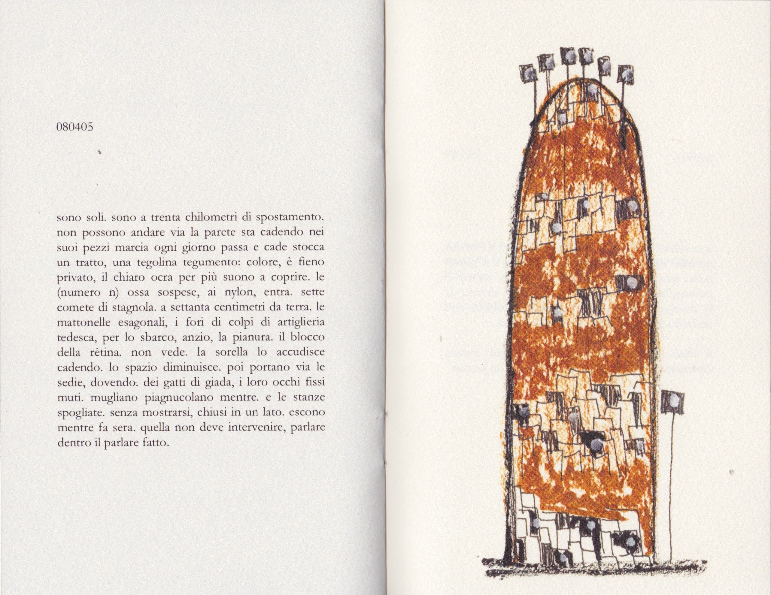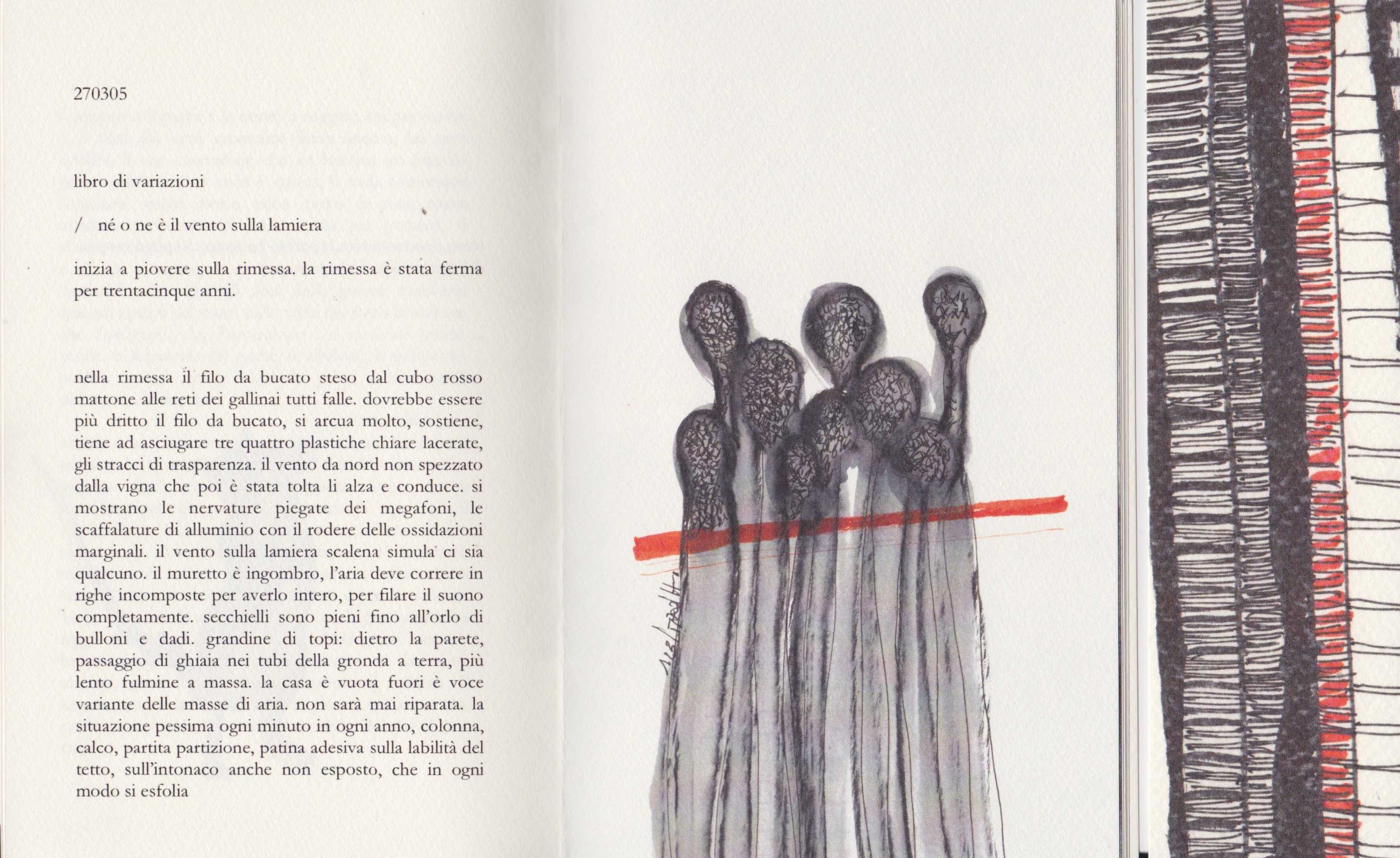Alcune strutture elencative, così come – al contrario – certi meccanismi grafici o sintattici di sgretolamento testuale, potrebbero suggerire una riflessione sulla loro natura di possibili didascalie del disastro, vissuto abbandonando una dimora che in verità era pressoché una collezione di nonluoghi, hangar, un aeroporto, una città, una fabbrica di fabbriche. Però forse vale qui, semmai, una specie di contorta formula documentaria, o diario, probabilmente qualcosa che si avvicina al Ponge del “periodo che annuncia la primavera”. Senza primavera.