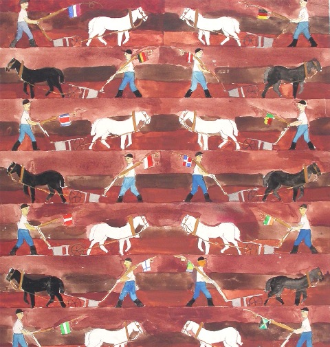 Siamo una specie intelligente, anche se magari un pochino meno di prima, questo non si nega, e abbiamo visto che se preparavamo la terra con uno strumento idoneo, che abbiamo chiamato aratro, i semi attecchivano meglio, e le piante erano più contente. Perché le piante coltivate non amano le erbacce, insomma quelle che consideriamo erbacce, e amano trovare il terreno morbido e arioso. Nel frattempo avevamo adottato i metalli, e quindi gli aratri erano molto più robusti, sempre più robusti, e più pesanti. Per tirarli ci attaccavamo dei buoi, e dopo qualche rapidissimo migliaio d’anni dei motori con le ruote, che chiamiamo trattori. Abbiamo arato tutte le foreste di pianura, e non solo quelle, per creare campi arati, sempre più campi arati, campi arati dappertutto, basta vedere il disegno di Silvia. Spesso alla terra non piaceva essere arata, e se ne è andava via. Siamo sempre più numerosi, e sempre più affamati di animali, che mangiano tantissimo, e quindi abbiamo bisogno di tantissimi campi arati.