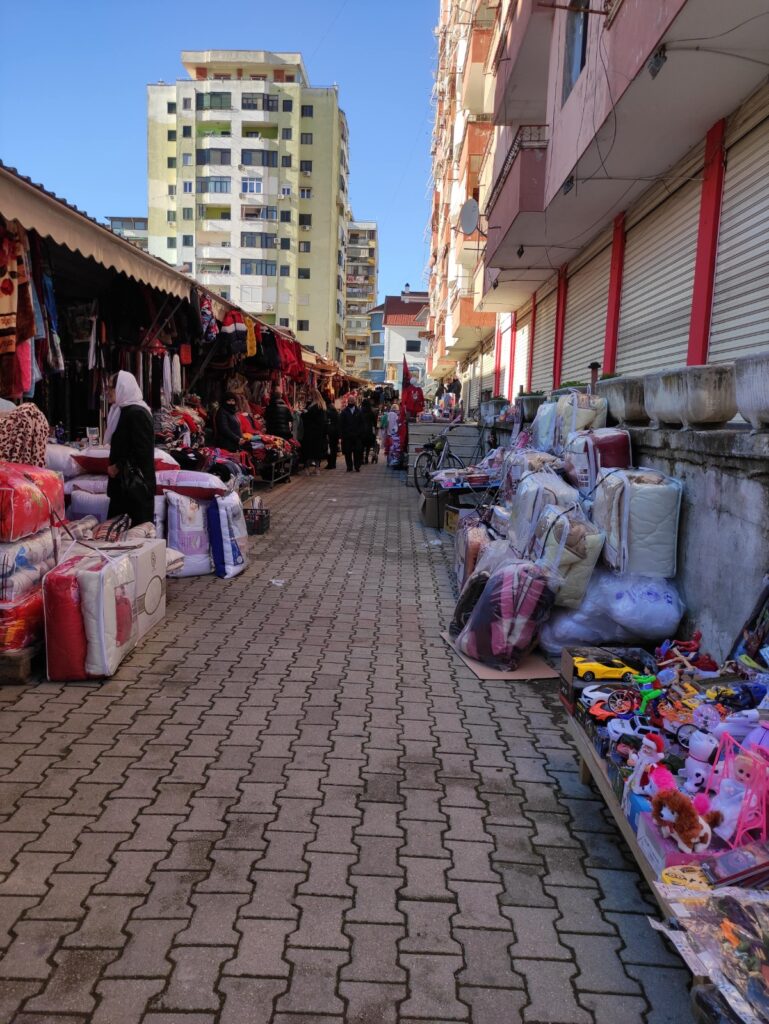 Il mercato di Durazzo è l’Oriente esotico che si sviluppa inaspettato, senza considerare l’occhio del turista. Non si piega alla standardizzazione – esiste nonostante. Fuori dall’immaginario da cartolina, pullula di vitalità – si può dire: esagerata, di urla da una parte all’altra della strada, battute, sorrisi, prezzi contrattati, slogan buffi per attirare la clientela. Visitato dalla gioia, è quanto immaginiamo dell’Oriente dei bazar (in albanese: pazar). Il mercato di Durazzo, quando sei triste, ti risveglia il buonumore, come un quadro di Pontormo dopo le nature morte di Morandi. Dio è il seme di papavero più piccolo al mondo / scoppia di grandezza, scriveva Zagajewski. E Dio qua lo si trova nelle mani di una signora che fila la lana, nel sorriso di un’anziana che vende pannocchie sul ciglio di una strada, nel ciuffo di ҫaj mali (thé di montagna albanese), nel pomodoro cuore di bue aperto a metà, nelle olive di Berat, formaggio di Argirocastro, generosità delle portate.