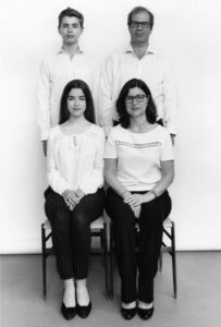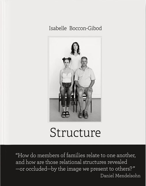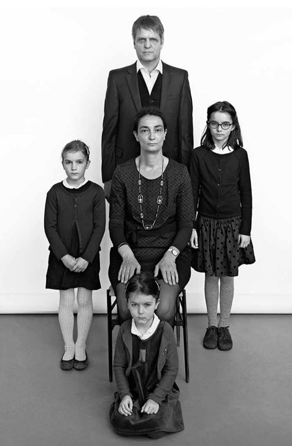 Structure si compone di una serie di ritratti di famiglia: scatti in posa, in bianco e nero, dei quali colpisce immediatamente la simmetria e geometria delle inquadrature. Scatti in cui nuclei famigliari diversi e vari per composizione – numerosi o più ristretti, più e meno misti quanto a provenienze – invitati nello studio di Isabelle Boccon-Gibod si concedono al suo sguardo fotografico. Lo studio è un loft a Parigi, dalle parti di Port Royal, un immenso spazio inondato di luce grazie a una gigantesca finestra affacciata sul cielo. Lì i suoi soggetti, obbedienti ma liberi, si sono di volta in volta adeguati a quanto da lei richiesto per esigenza narrativa. Per prima cosa si è trattato per loro di scegliere come disporsi nello spazio, ma lungo griglie invariabilmente fisse, geometriche. In un secondo tempo, in virtù di quell’alchimia specialissima che può essere di un set fotografico, è stato chiesto loro di esprimersi così, nell’obbedienza allo schema prossemico: lasciar trapelare il loro rapporto con il nucleo e con la natura di ciascun legame interno alla struttura. Ogni membro delle famiglie ritratte in Strucuture racconta attraverso postura ed espressione cosa lo leghi sia agli altri, sia al “nucleo famiglia” inteso come struttura di cui lui/lei/loro sono parte. Il risultato è una griglia di linee assiali, segmentate da dinamismi interni tutti ispirati alla linearità. Geometria come solida sponda di contenimento alle passioni e ragioni dei protagonisti dei ritratti – passioni compresse, che proprio perché compresse lasciano emanare la loro forza. Arabeschi di rapporti dove le emozioni si dispongono e parlano secondo le stesse traiettorie che sono delle posture e disposizioni nello spazio di ciascuno.