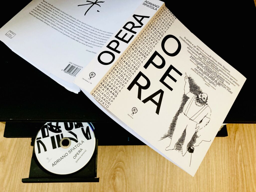Per una maggiore aderenza informativa, il volume in questione antologizza per la prima volta tutte le raccolte poetiche lineari, concrete e visuali di AS e offre inoltre un CD con 15 tracce, testimoni delle sperimentazioni sonoro-performative dell’autore; un vero tesoro per le generazioni che non hanno potuto partecipare alle sue ormai leggendarie azioni di «Poesia totale», ovvero di una poesia incessantemente confrontata e sovrapposta alle novità delle arti e dei media, per dilatarne il potenziale e sondarne gli esiti. I testi recuperati dalla vicenda spatoliana sono introdotti da un corposo saggio di Giovanni Fontana, intitolato Guarda come il testo si serve del corpo e assai utile a presentare le varie fasi di produzione artistica del compagno di strada. Nel complesso, Opera si presenta come oggetto accattivante per l’originalità del formato – più vicino a quello di un catalogo d’arte – e per la creatività grafica, che mira a una sintonia con la contaminazione sperimentata dal poeta e cerca di evitare un’esperienza «normalizzata» e univoca di fruizione, naturalmente per quanto possibile all’interno di un libro.