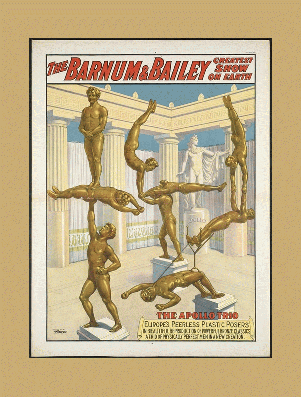 ✱ Grossa carriera come ginnasta. Formò un trio atletico, artistico, il trio Apolllo, con lui Vittorio Battaglia, il Franzoni e il Gradella. Vestiti da greco romani e tutti dipinti d’oro sul corpo, Vittorio sempre in cima alla piramide umana in equilibrio sulle mani. Si esibivano nelle società di ginnastica e poi in piccoli spettacoli nei varietà e nei locali nei café chantant. Andavano anche in tournée in altre città italiane il sabato e la domenica. Fino a quando un impresario li scrittura a Genova per l’America del Nord e approdano nel circo Barnum and Bailey.