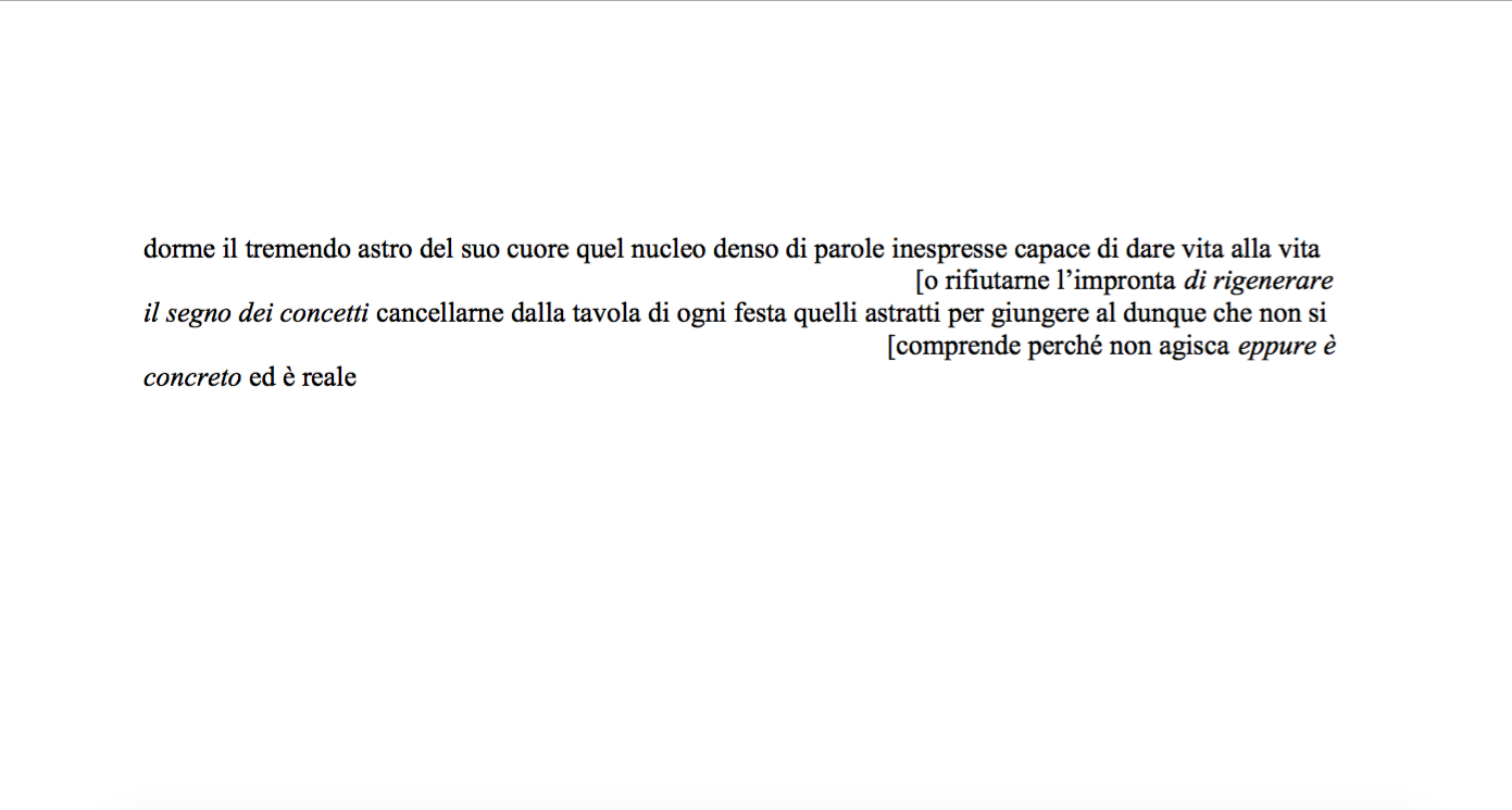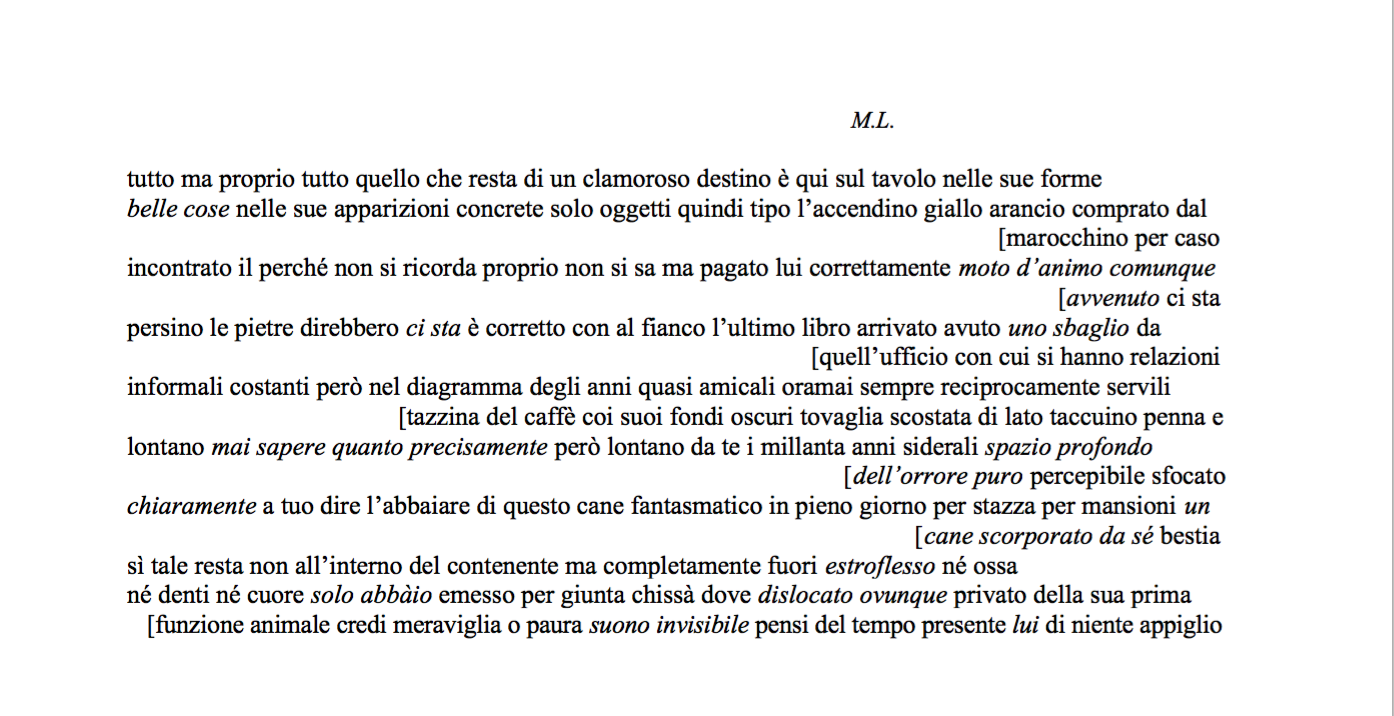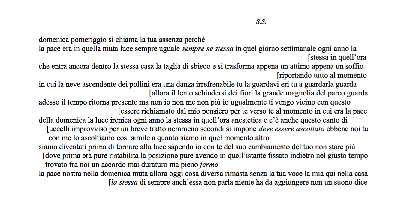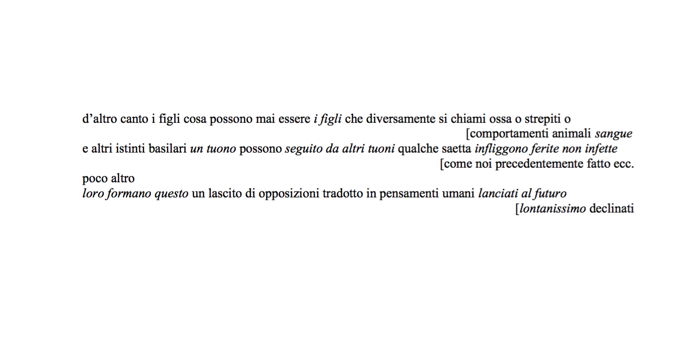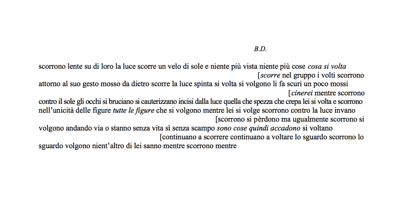 Il verso extralungo ne è il motore principale: nella sua dinamica ossessiva, ogni verso conduce la lettura a una sorta di picco di tensione accentuale, intorno alla metà, per poi progressivamente esaurirsi andando verso la fine – mentre un’altra tensione prosegue sino in fondo, con il classico effetto di saturazione che è sempre l’effetto di una dilazione troppo prolungata, qui come alla ricerca dell’aria che non arriva mai, perché manca il tempo per inspirare, quasi in apnea. Il verso extralungo diventa in questo modo una sorta di brodo che amalgama qualsiasi cosa, dove tutti i sapori si mescolano, ma nessuno scompare davvero del tutto, e ciascun sapore sembra continuare a richiedere la propria autonomia, il proprio legittimo sviluppo narrativo, ma senza averne il modo, senza averne il tempo, senza avere aria a sufficienza per farlo.