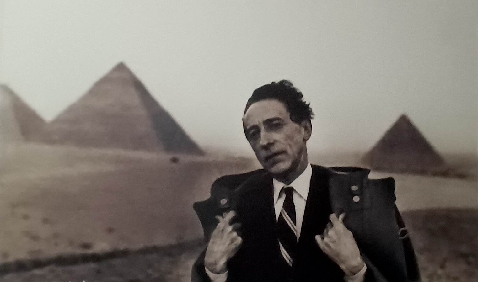 La guida arriva un po’ in ritardo, affannata dal tour precedente: «Siete troppi!», esclama sorridendo, alludendo al viavai di turisti senz’altro maggiore nel mese di agosto. Si comincia con quella che era stata la cucina della casa, sulla cui struttura era intervenuto lo stesso Cocteau, nella quale hanno allestito un tabellone di foto e dati biografici che non avrei il tempo di guardare neanche volendo, dato che la guida sta facendo la sua introduzione: succede insomma un po’ come durante i convegni, in cui è impossibile leggere il testo sulle slide proiettate mentre il relatore sta dicendo altro (eppure la formula viene riproposta sistematicamente). Faccio in tempo a vedere un ritratto dell’autore che non conoscevo, fotografato in Egitto, con le piramidi alle spalle.