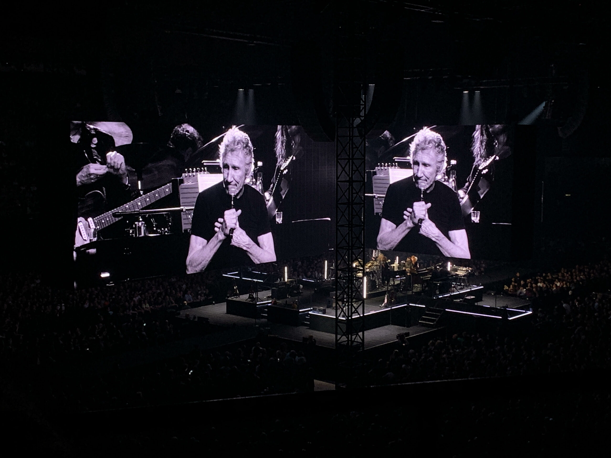 Alla fine del rito mondano il pubblico è derubato della luce che fino ad allora l’aveva illuminato, e l’Unipol Arena, nera, apocalittica, asfittica, è rischiarata da una gigantesca scritta sul maxi schermo: FREE JULIAN ASSANGE. Alzo gli occhi e penso che non c’è bisogno di far politica per schierarsi nel sociale. A tratti la giustizia è semplicemente lì che brilla. Seguono scritte minimali accanto al volto in bianco e nero di Roger Waters che canta De Javu, da solo, con una chitarra acustica e ventimila persone pronte a diffondere apostolicamente il verbo della libertà e dei diritti umani. “LOCK UP THE KILLERS, FUCK THE PATRIARCHY” e ancora “WE ALL NEED RIGHTS”. Siamo tutti uniti, questa volta non scoordinati, questa volta lo percepisco. Per colmo di schizofrenia il satiro mette fine alla patetica sviolinata sui diritti umani e invia il segnale: ecco il ritmo di un registratore di cassa in sette quarti, un maiale immerso nel verde sul maxischermo, un riff semplicemente immortale, e l’intera Unipol Arena viene giù d’un fiato. Particolare plauso nell’esecuzione di Money va dato ai musicisti solisti, sassofonisti e chitarristi che hanno fatto i compiti e non cannano una singola nota rispetto alle partiture originali di The Dark Side Of The Moon, opera alla quale il satiro Waters ha scelto di dedicare l’ultima parte del concerto.