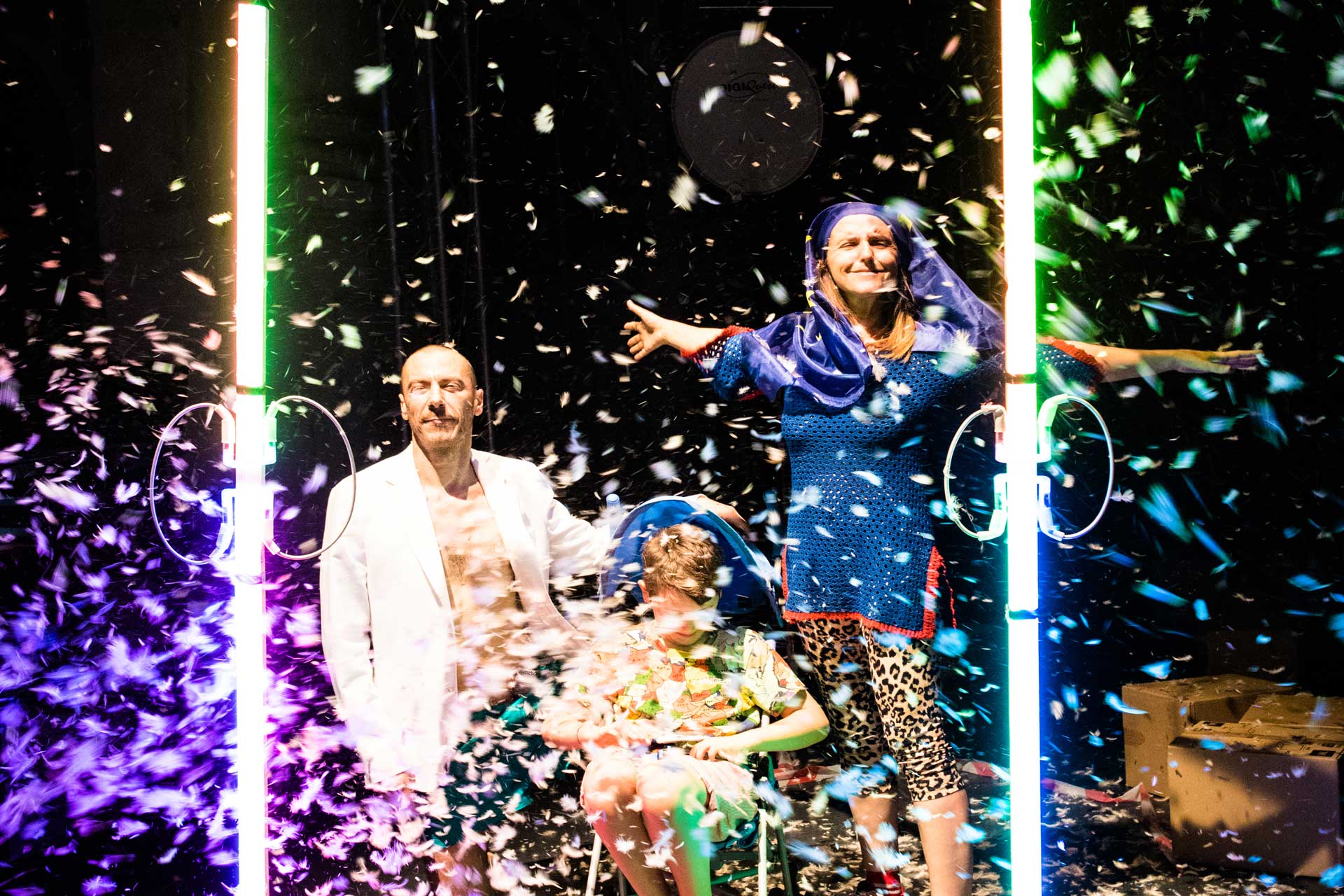 Dichiariamo subito le costanti della poetica sovversiva del loro teatro pop-rock-punk che abbiamo ancora una volta piacevolmente ritrovato: una drammaturgia apparentemente destrutturata, spesso declinata attraverso lunghe elencazioni, abbinamenti non-sense, elementi di denuncia sociale e momenti di pathos integrati in una parodia della società dall’ilarità irrefrenabile; irruzioni musicali ad altissimo volume, luci a tratti accecanti, colori sgargianti. Le scene allestite dai Babilonia Teatri, così come le loro drammaturgie, sono un coacervo di ready-made decontestualizzati e rimontati con un effetto fortemente straniante. Sul palco ci può stare di tutto, nel tentativo di ridurre la complessità della realtà ad un microcosmo che inevitabilmente finisce per apparire caotico: antenne, una pianta appesa a testa in giù, un divano ciclopico gonfiabile, persino una betoniera; e soprattutto si può fare di tutto: saltare su un tappeto elastico, usare un letto a rotelle come una giostra rotante, far deflagrare due cuscini e spargere le loro piume al soffio di un ventilatore. Tutto in un’orchestrazione mai improvvisata, dominata con precisione e sicurezza, puntellata da istanti iconici ed epigrammatici di grande incisività.