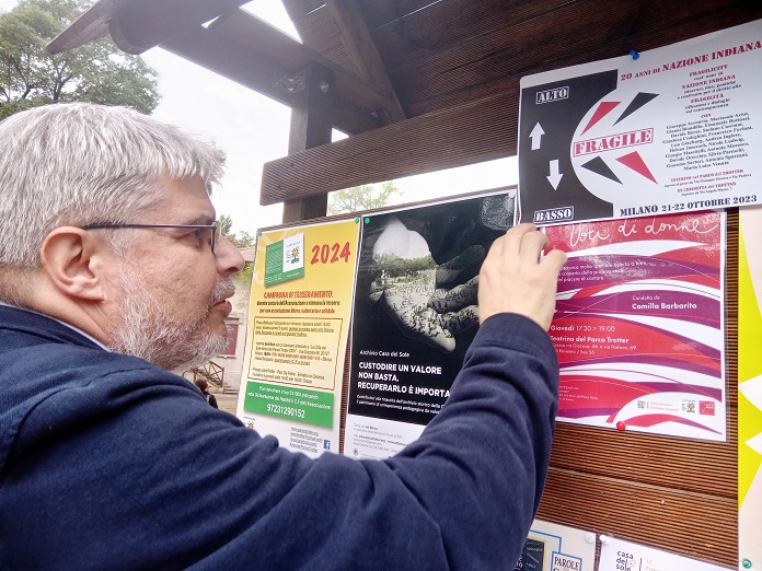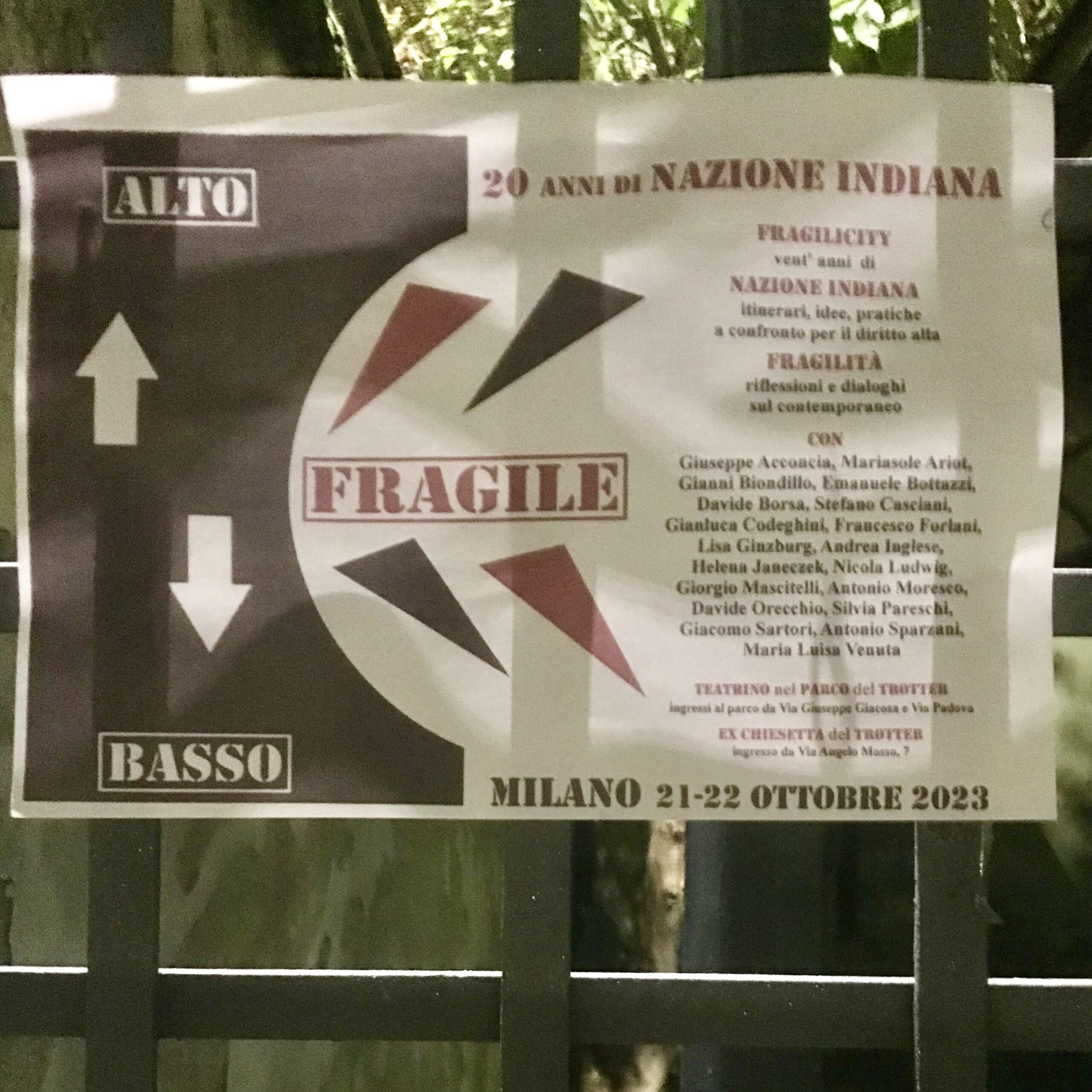 Ho il sospetto che questo cartello appeso all’ingresso di via Mosso – per l’appuntamento serale – ce lo siamo dimenticati lì. Tutti gli altri, distribuiti nel parco del Trotter come Pollicino, li dovremmo aver portati via.