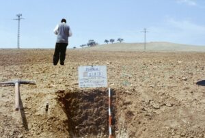 La prima cosa che facciamo noi pedologi, una volta aperta una buca che ci permette di avere davanti tutta la sezione verticale della terra, è vedere quanti orizzonti ci sono, e di che sorta. A parte i colori, le differenze riguardano caratteri visibili a occhio nudo, quali la porosità, l’organizzazione spaziale e la quantità di pietre, o anche rilevabili al tatto, quali la consistenza. Anche l’abbondanza e l’andamento delle radici fornisce utili informazioni. Poi naturalmente le analisi di laboratorio effettuate sui campioni prelevati permettono di andare molto più in profondità.