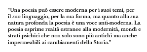 Una poesia può essere moderna per i suoi temi, per il suo linguaggio e per la sua forma, ma quanto alla sua natura profonda la poesia è una voce antimoderna La poesia esprime realtà estranee alla modernità, mondi e strati psichici che non solo sono più antichi ma anche impermeabili ai cambiamenti della Storia. Sin dal Paleolitico la poesia ha convissuto con tutte le società umane; non c’è una società che non abbia conosciuto questa o quella forma di poesia. Ora, benché vincolata a un suolo e a una storia, la poesia si è sempre aperta, in ciascuna delle sue manifestazioni, verso un al di là sovrastorico. Non alludo a un al di là religioso. Parlo della percezione dell’altro lato della realtà. Si tratta di un’esperienza comune a tutti gli uomini di tutte le epoche e che mi pare anteriore a tutte le religioni e a tutte le filosofie.