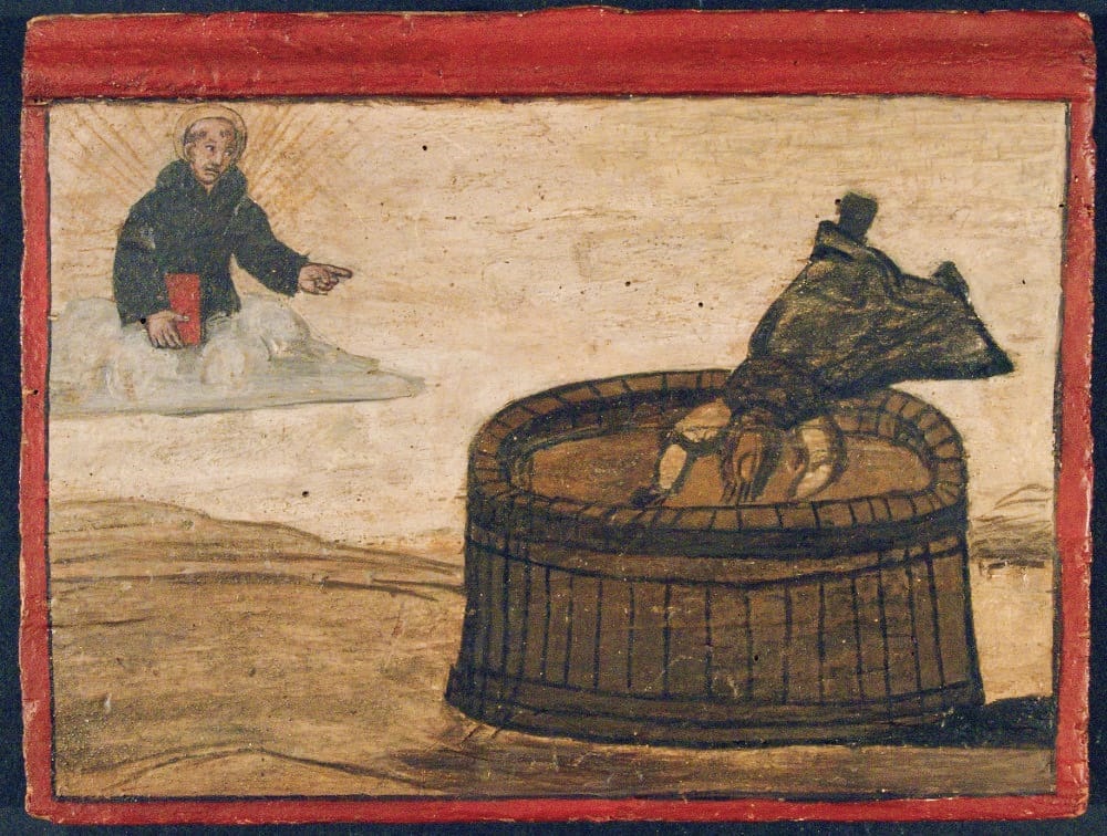 San Nicola salva una donna caduta in un tino. XVI secolo, tempera su tavola, 21,3 x 28 cm, Museo di San Nicola, Tolentino (MC)